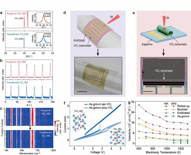 图 a.外延VO2薄膜剥离前后XRD图谱,插图为对应的摇摆曲线测试。b.外延VO2薄膜剥离前后XRD φ扫描图谱。c.外延VO2薄膜剥离前后线扫描Raman光谱。d.外延VO2薄膜的柔性红外探测器。比例尺为1cm。e.基于卷曲外延VO2薄膜的红外探测器。比例尺为200 μm。f.多晶VO2薄膜和外延VO2薄膜的I-V曲线。g.不同种类红外探测器的探测率(D*)对比