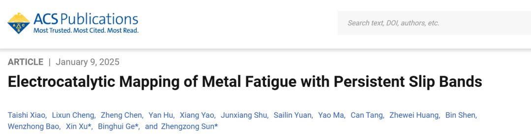 1月9日,微电子学院孙正宗课题组提出了一种具有时-空分辨率的电催化金属疲劳无损检测方法,通过建立电催化二氧化碳还原性能与金属铜表面位错缺陷之间的关系,放大了疲劳金属中位错聚集区域的电化学信号,依靠这个技术仿佛拥有了一个缩小版的“电催化”医生,可以在金属表面探测微小区域的位错聚集,从而在金属疲劳的早期对其做出准确预测。通过电催化Mapping实验,能够以亚毫米级分辨率实现金属疲劳的空间可视化,其中在富含Persistent Slip Band结构(PSB)的Cu表面,测得的电流信号比未疲劳金属高出约16.5倍;同时,在金属失效之前,C2产物的电流密度增加了78倍,实现金属疲劳的早期检测。通过密度泛函理论(DFT)计算进一步阐明了位错结构与电催化信号之间的构效关系。不仅如此,这种无损的电催化检测方法还适用于多种常见金属,包括铜、银、铁和铝。未来有望应用于金属疲劳的快速检测,提前防范重大安全事故,为制造更加安全的飞机,准确预测桥梁的寿命提供新的方案。这一研究成果以“Electrocatalytic Mapping of Metal Fatigue with Persistent Slip Bands”为题发表于美国化学会杂志JACS。