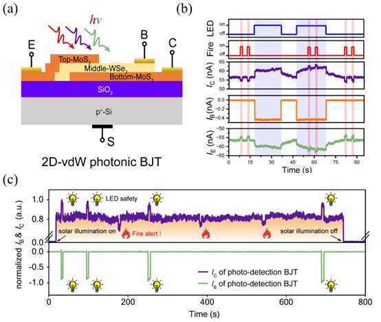 图 二维范德华光电子双极型晶体管(2D-vdW photonic BJT)设计及集成应用演示。(a) 2D-vdW photonic BJT原理图;(b)在有LED干扰的环境中的火灾警报测试;(c)二维光子传感芯片LED光干扰环境下全天火灾报警应用演示。