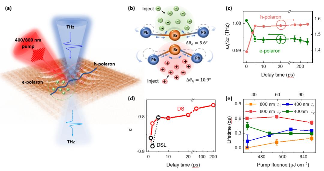 图.(a) 光激发后极化子形成示意图 ;(b) 注入电子或空穴后对晶格的影响;(c) 电导率谱线上Lorentz峰值对应频率随延迟时间的变化;(d) 薄膜材料中提取的背散射因子c在DS或DSL模型中随延迟时间的变化;(e) 400/800 nm光激发下载流子冷却和极化子形成过程的寿命与泵浦能量密度的依赖关系。