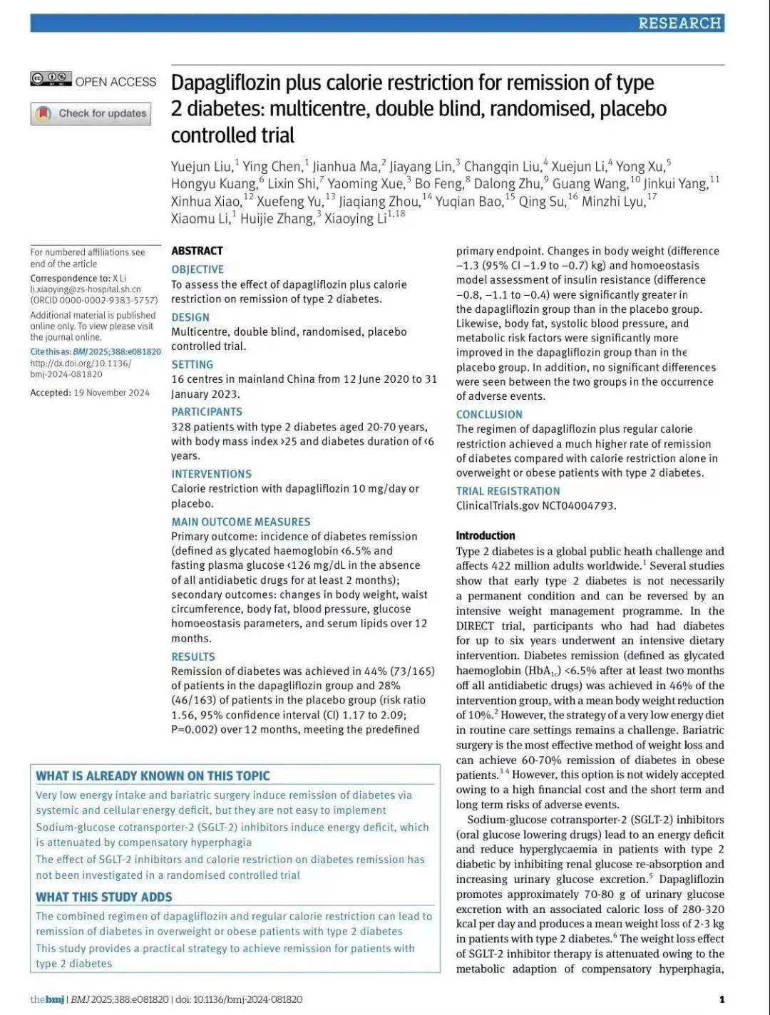 1.BMJ|复旦大学附属中山医院内分泌科李小英、李晓牧团队在2型糖尿病缓解研究中取得重大突破