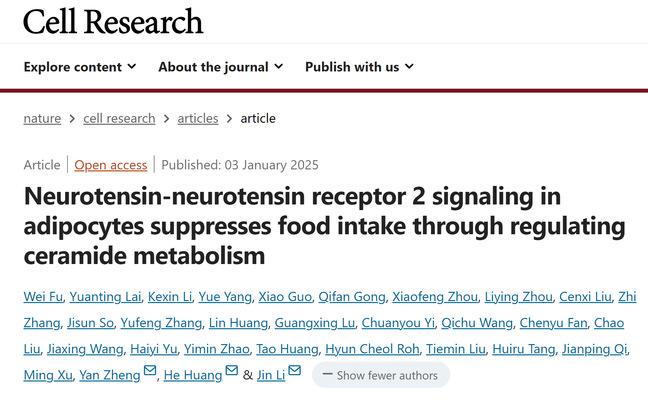 1月3日,生命科学学院李晋研究员、代谢与整合生物学研究院黄河研究员、生命科学学院郑琰研究员合作,在Cell Research上发表了题为“Neurotensin-Neurotensin Receptor 2 signaling in adipocytes suppresses food intake through regulating ceramide metabolism”的研究论文,发现了淋巴内皮细胞调控进食的分子机制。该项工作证明了淋巴内皮细胞可以通过旁分泌功能,调控外周-中枢交互,从而发挥神经调控作用,拓展了学界对于淋巴内皮细胞生理学功能的认识。
