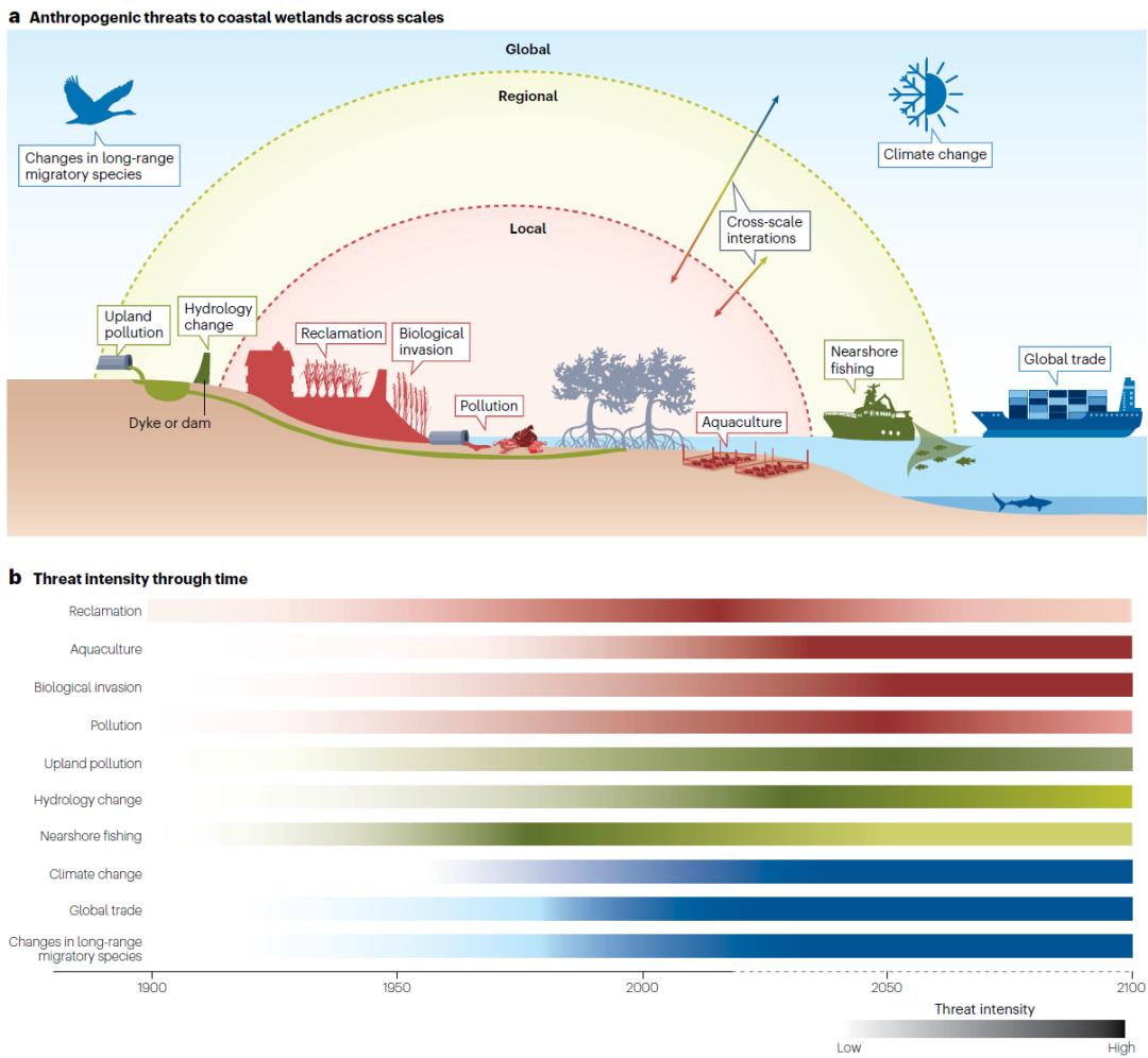 1月15日,受《自然综述•生物多样性》(Nature Reviews Biodiversity)主编Alexa McKay邀请,生命科学学院贺强团队在该期刊创刊号发表题为“Coastal wetland resilience through local, regional and global conservation”的论文。全球现有约354,600–355,120 km2的滨海湿地(盐沼、红树林和潮滩)生物多样性受胁程度高,在世界自然保护联盟红色名录收录的1589种滨海湿地动植物中,17%为濒危和近危物种,濒危/近危哺乳类和软骨鱼类动物更高达71%和83%。通过整合分析不同空间尺度上滨海湿地人为胁迫的变化趋势,研究提出,虽然近年来随着保护力度的强化,围垦、捕捞等一些局域尺度人为胁迫在部分国家或区域已开始减弱,但养殖、生物入侵、气候变化等人为胁迫,特别是区域尺度和全球尺度上的人为胁迫,预期在未来仍将持续加剧。这些区域和全球尺度的人为胁迫虽在短期内常不会直接导致滨海湿地的大幅丧失,但可通过影响生物多样性等而降低滨海湿地的质量。研究进一步提出,滨海湿地对人为胁迫的韧力由湿地的质量决定,受不同尺度上物理(沉积物供给、潮汐状况、地形地貌等)和生态因素的调控。局域、区域和全球尺度因素对滨海湿地韧力的影响通常并不独立,而是存在跨尺度互作效应。未来需要在局域、区域和全球等多个尺度上,推动滨海湿地保护修复从重点关注湿地面积向着力提升湿地质量和韧力转变,促进滨海湿地生态保护修复的提质增效。