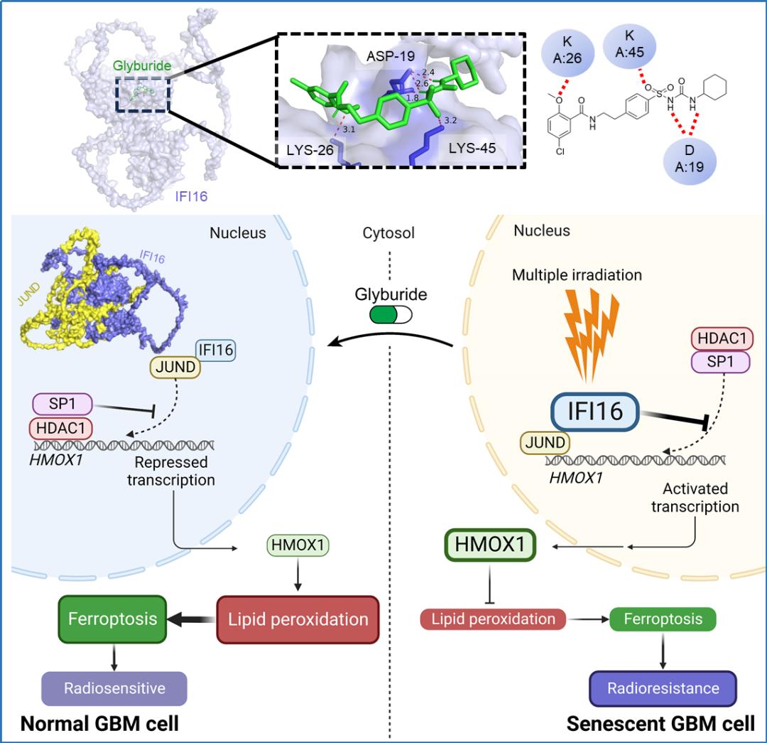 1月31日,放射医学研究所邵春林团队在《自然-通讯》(Nature Communications)杂志在线发表了题为“Cellular senescence-associated gene IFI16 promotes HMOX1-dependent evasion of ferroptosis and radioresistance in glioblastoma”的研究成果。该研究首次阐明细胞衰老相关基因IFI16介导的铁死亡逃逸机制在胶质瘤辐射抵抗中的关键作用,并创新性发现经典降糖药物格列本脲(Glyburide)可通过靶向调控该通路显著提升辐射敏感性,为胶质瘤治疗提供了全新策略。团队通过构建辐射抵抗胶质瘤细胞模型,发现IFI16引起的细胞衰老样表型(Cellular senescence-like phenotype)是导致辐射抵抗的一个关键诱因。细胞衰老相关蛋白IFI16通过与转录因子JUND和SP1相互作用,可激活铁死亡调控因子HMOX1转录,显著降低细胞内脂质过氧化、活性氧及亚铁离子水平,抑制辐射诱导的铁死亡(Ferroptosis)发生,最终导致肿瘤细胞的辐射抵抗。该研究还突破性地提出老药新用策略,发现经典降糖药Glyburide可特异性结合IFI16的pyrin结构域,破坏其与转录因子JUND和SP1的相互作用,抑制HMOX1转录,从而干扰细胞衰老样表型产生,增强肿瘤辐照后的铁死亡水平,增加胶质瘤辐射敏感性。研究首次构建了以IFI16为核心的“细胞衰老-铁死亡逃逸”的分子调控网络,并针对性的发现了新型胶质瘤辐射增敏药物,为胶质瘤辐射抵抗形成机制提供了全新理论框架,有望成为基础研究向临床转化的重要桥梁。