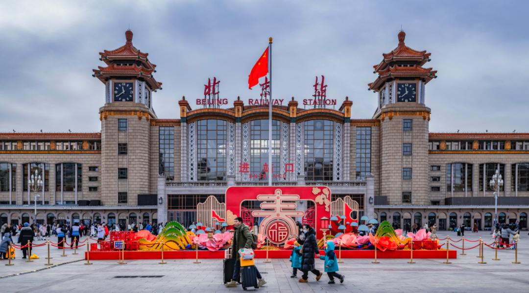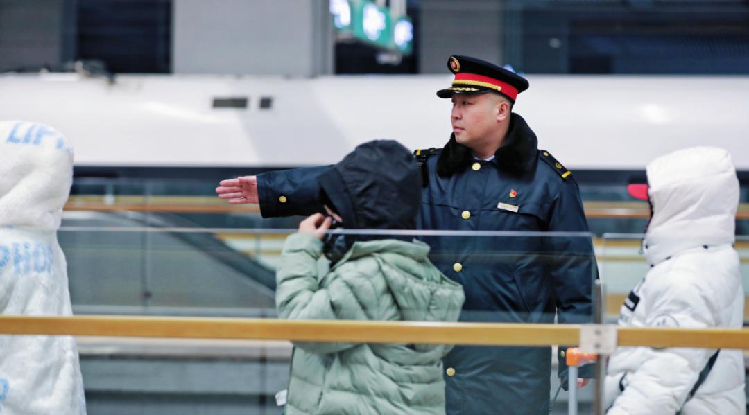 2月10日19时12分 ,北京朝阳站客运值班员邵辰飞引导旅客安全有序出站。