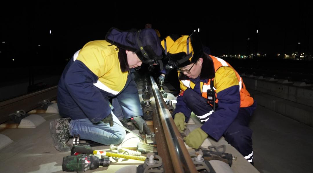 2月10日1时30分,唐山工务段线路工裴旭阳、王伟光进行线路精调作业。