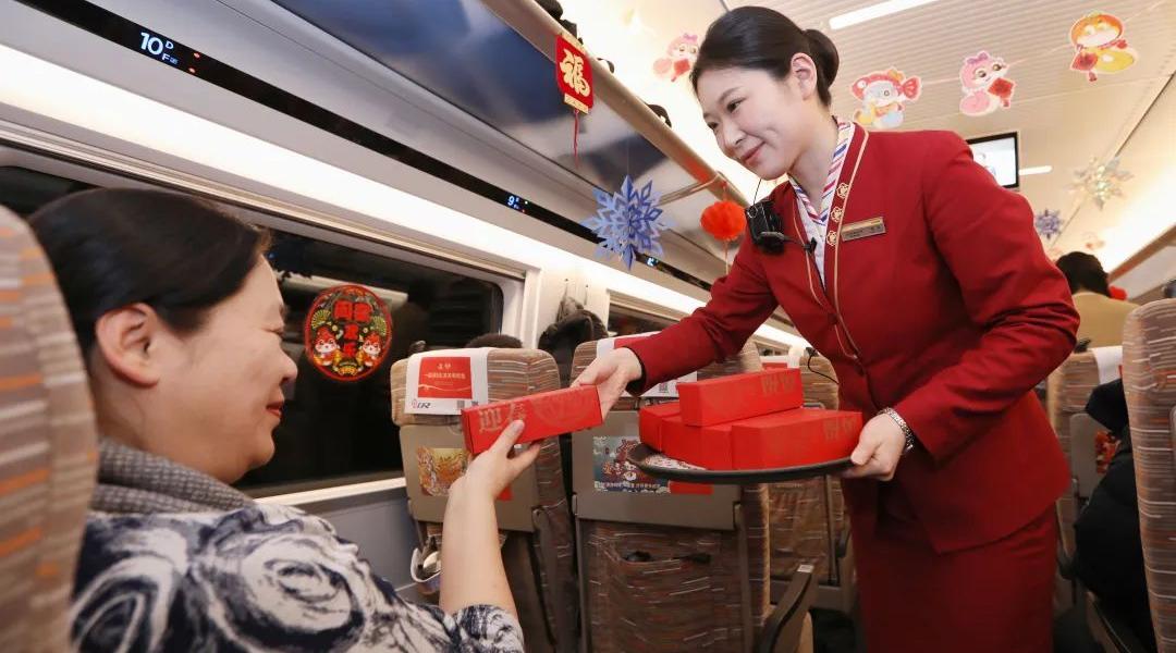 2月12日10时10分,北京客运段乘务员陈爽为旅客发放元宵节纪念品。