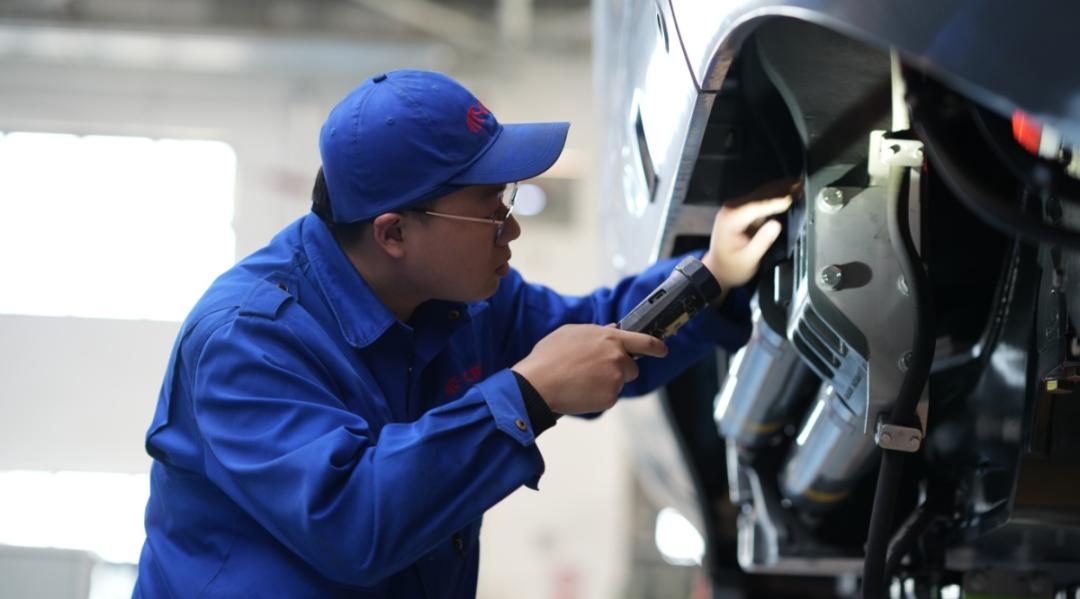 2月17日15时30分,北京动车段地勤机械师孙文轩检查动车组车体状况。