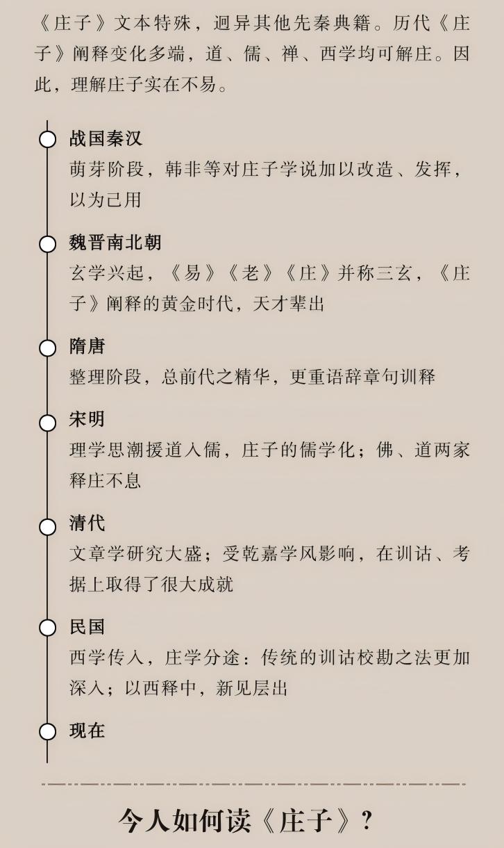 全书以宋高宗时鄂州刻《南华真经》为底本,融贯历代《庄》解,特别吸收了明清文章学的治《庄》精髓,义理与辞章并重。在此基础上,对《庄子》中的字词和意象进行了独到的解读,纠正了许多流传下来的错误理解。因口说而成文,全书毫无“学究气”,语言通俗流畅,间杂不少值得玩味的生活经历,以一种轻松且有趣的方式呈现了庄子的哲学内涵。