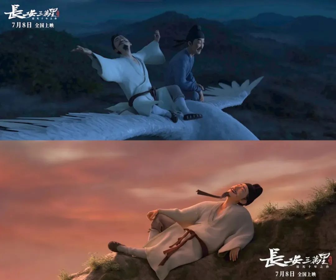 (电影《长安三万里》剧照)上述为《庄子》各类注本中“逍遥义”的大致发展脉络。在诗文中,“逍遥义”的发展则主要体现为大鹏形象的发展。现所见最早涉及鲲鹏故事的是西晋阮修《大鹏赞》,从佚文来看,文章主题是通过赞美大鹏,来表达一种远害全身的观念,像大鹏一样飞到远的地方去,远离祸害保全性命。而到了唐朝,整个社会有一种盛唐气象,对大鹏形象做了较大揭示发展的是诗仙李白。李白写的大鹏比《庄子》里边的还要大,他说大鹏飞起来海动山摇,烛龙、列缺给它做护卫,玄风、 金乌、天鸡、精卫这些神鸟都不如它逍遥。李白这么一弄,一直到现在,大鹏的形象在诗文里面大量出现,我们祝贺别人总说鹏程万里,很多人给小孩取名鹏,他们竟不知道大鹏不是得道的象征,在《庄子·逍遥游》里边是被否定的呢!