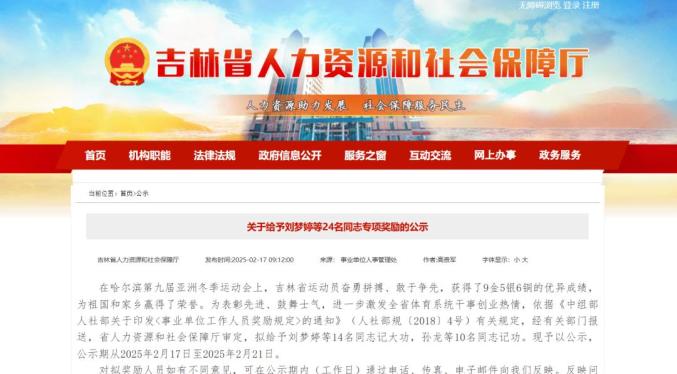 2月17日,吉林省人力资源和社会保障厅网站发布《关于给予刘梦婷等24名同志专项奖励的公示》,详情如下: