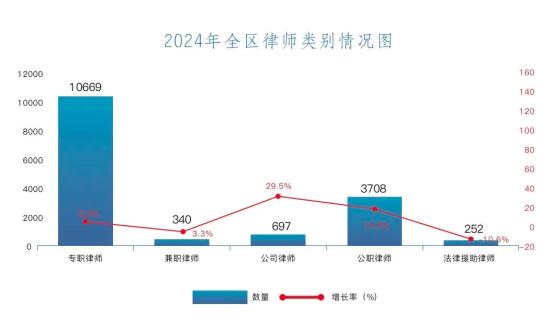 律师队伍蓬勃发展2024年,全区共有执业律师15666名,比上一年增长1306名,同比增长9%,全区每万人拥有律师约6.5名。同时,近5年律师数量增幅较快,平均增幅12.8%。