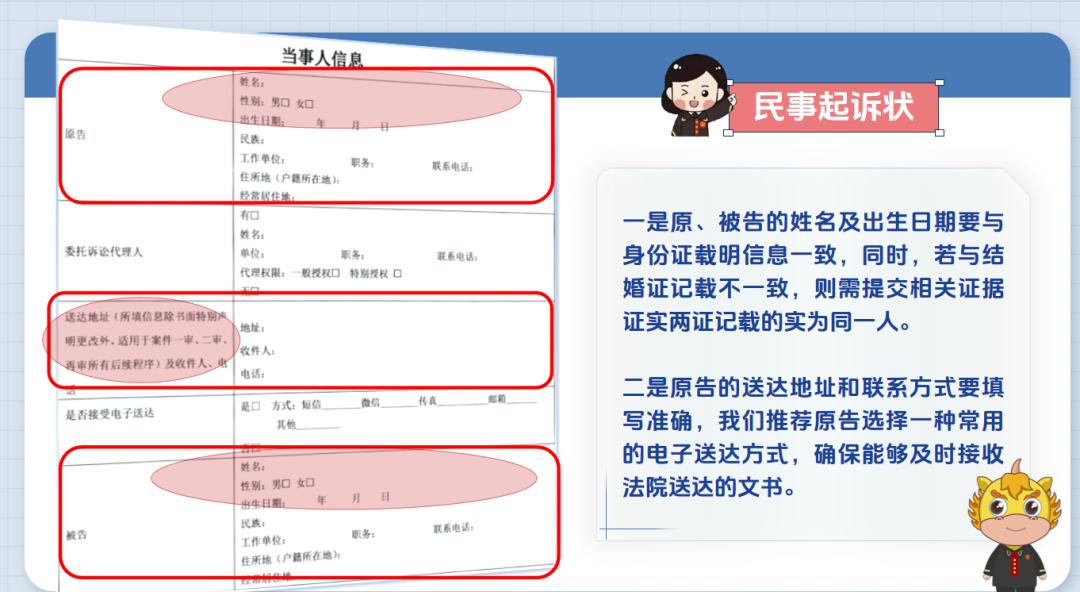首先,填写当事人信息时需要注意以下两点:一是原、被告的姓名及出生日期要与身份证载明信息一致,同时,若与结婚证记载不一致,则需提交相关证据证实两证记载的实为同一人。二是原告的送达地址和联系方式要填写准确,我们推荐原告选择一种常用的电子送达方式,确保能够及时接收法院送达的文书。