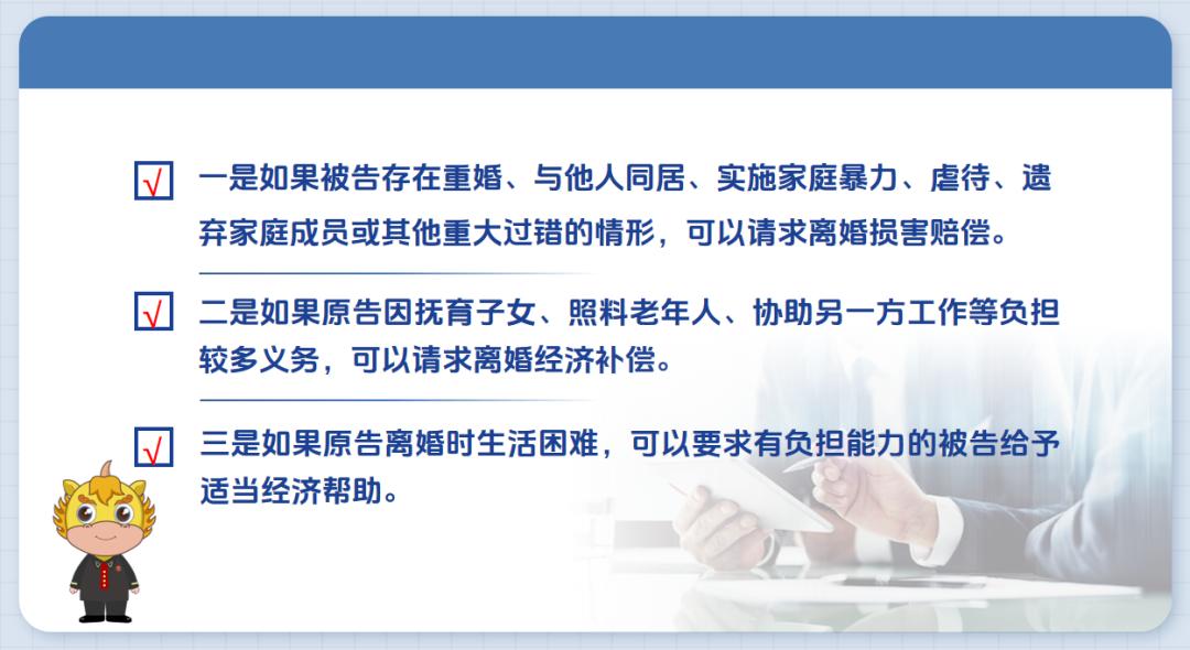 在填写第7项时,特别提醒注意三点:一是如果被告存在重婚、与他人同居、实施家庭暴力、虐待、遗弃家庭成员或其他重大过错的情形,可以请求离婚损害赔偿。二是如果原告因抚育子女、照料老年人、协助另一方工作等负担较多义务,可以请求离婚经济补偿。三是如果原告离婚时生活困难,可以要求有负担能力的被告给予适当经济帮助。这三项请求可在相应位置勾选并确定具体金额。第三,在填写约定管辖和诉讼保全时,需要注意:为防止被告恶意隐藏、转移、变卖、毁损、挥霍夫妻共同财产,当事人可以向法院申请财产保全。
