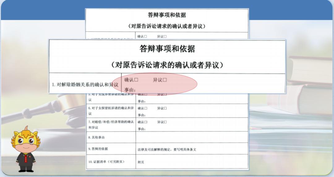 答辩事项和依据部分是答辩人对原告诉讼请求逐项表达认可或反对的意见。认可原告诉讼请求的,勾选“确认”;反对原告诉讼请求的,勾选“异议”,并在“事由”一栏详细写明原因。比如,“对解除婚姻关系的确认和异议”是必填项,如果同意离婚,则勾选“确认”。不同意离婚,则勾选“异议”,并写明原因。