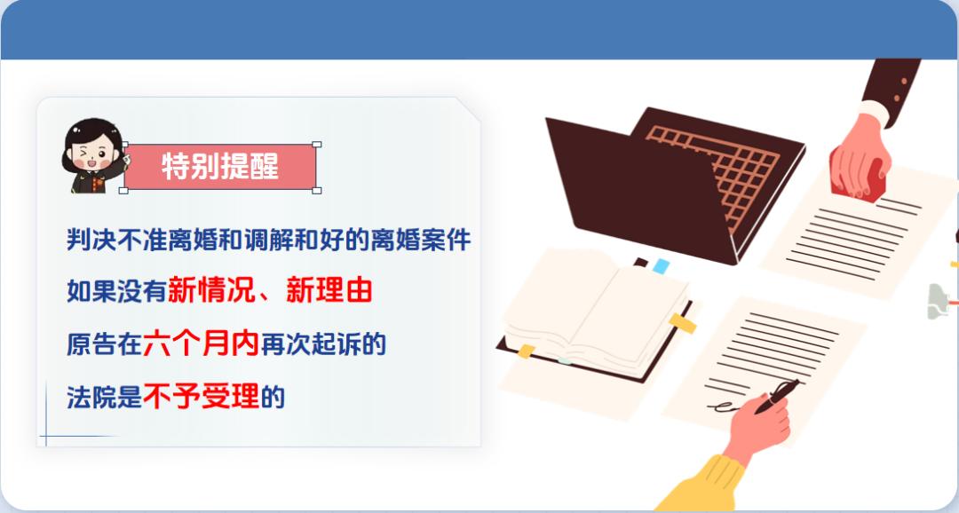 最后特别提醒一下:判决不准离婚和调解和好的离婚案件,如果没有新情况、新理由,原告在六个月内再次起诉的,法院是不予受理的。