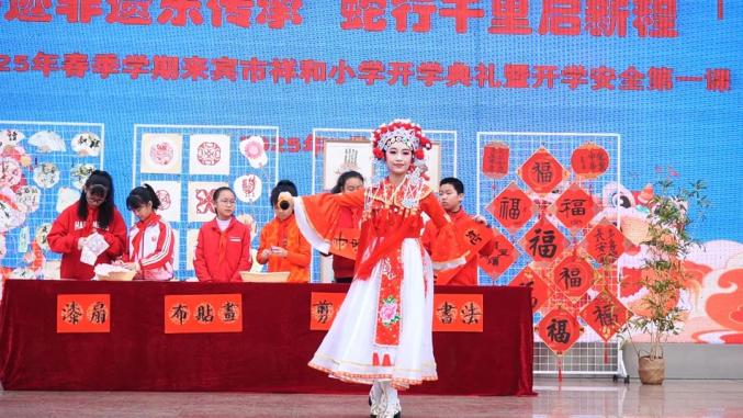 2月17日,来宾市祥和小学迎来了春季学期开学第一天。一场以“循迹非遗,乐享传承”为主题的开学典礼在学校操场隆重举行,为全校师生带来了一场别开生面的文化盛宴。开学典礼在庄严的升旗仪式中拉开帷幕。随后,同学们认真聆听了预防未成年人犯罪的法治第一课,增强了法治意识和自我保护能力。