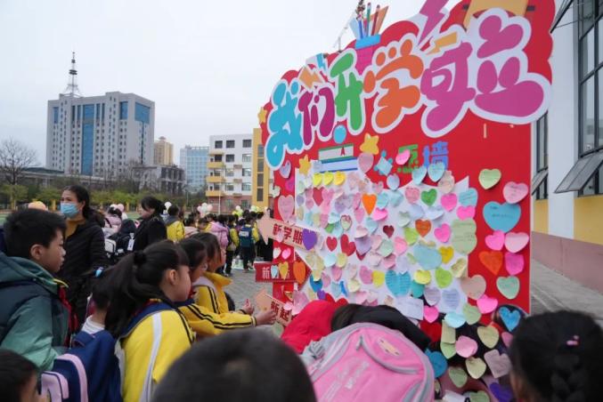 学生在心愿墙许下心愿。心愿墙前,同学们手持精心准备的爱心贴纸,满怀期待地将自己的新学期愿望贴在了墙上。一张张五彩缤纷的心愿贴,承载着孩子们纯真的梦想和对未来的无限期待。