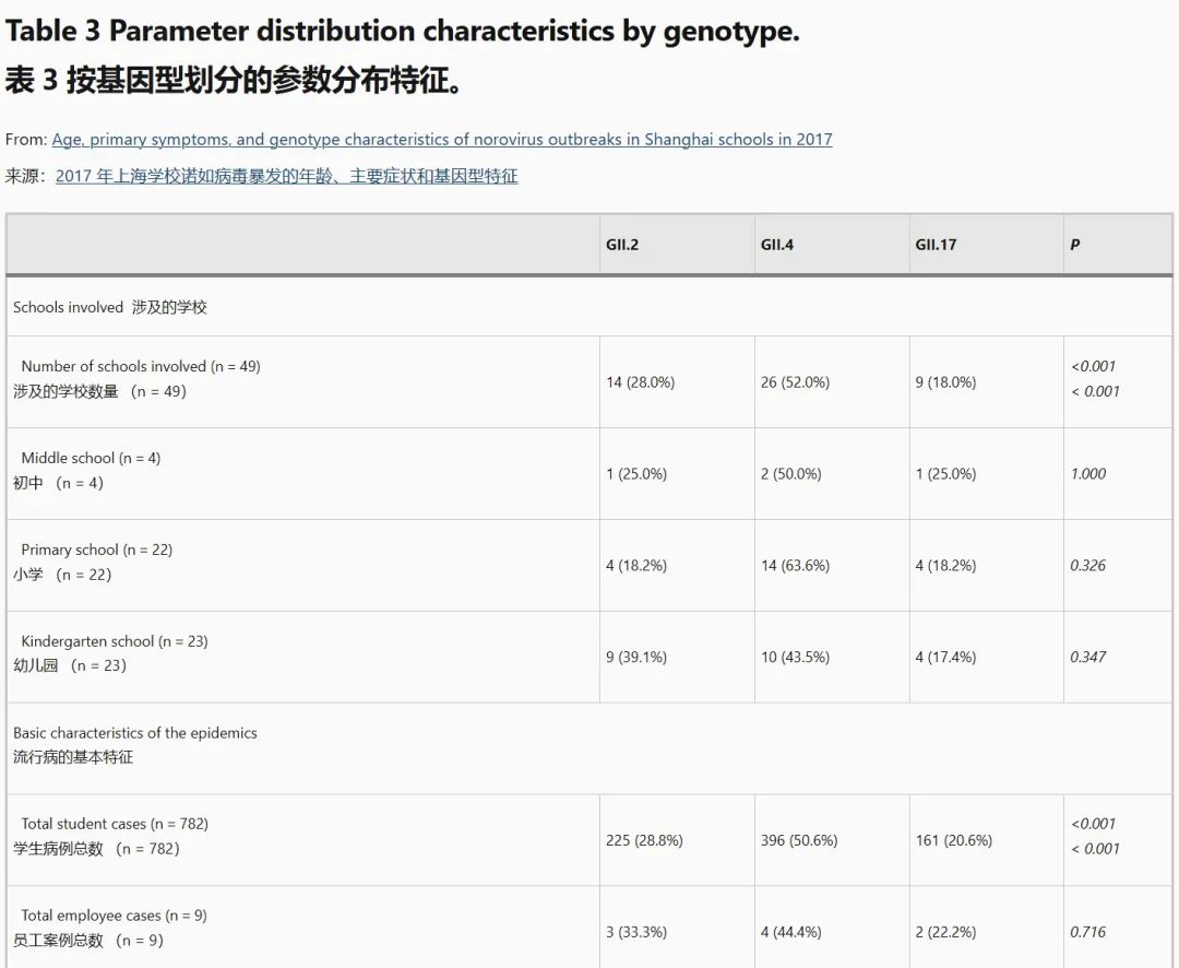 (▲https://www.nature.com/articles/s41598-018-33724-0)这篇研究显示,如感染GII.17后,大概率出现恶心和呕吐(P值<0.001);而不同基因型的病毒株引起的腹痛、发热和腹泻症状没有明显差异(P值>0.05)。