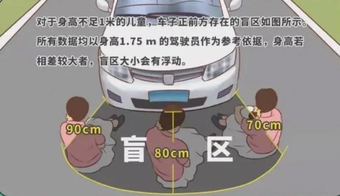 车子的正前方对于成年人,或者身高高于1米的儿童来说,即使站在车头下方也不存在盲区。不过对于身高在1米以下的儿童来说,却是一个大盲区。如果你坐在车内,可能完全不会留意到有儿童跑到了正前方。