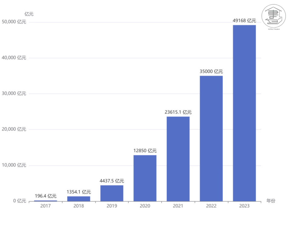 2017-2023年国内直播电商市场交易规模(数据来源:网经社《2023年度中国直播电商市场数据报告》)