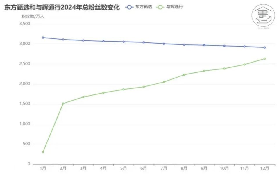 在2024年下半年,失去董宇辉的“东方甄选”继续掉粉,而“与辉同行”一路高歌猛进。至2024年年底,“与辉同行”粉丝数几乎追平“东方甄选”。