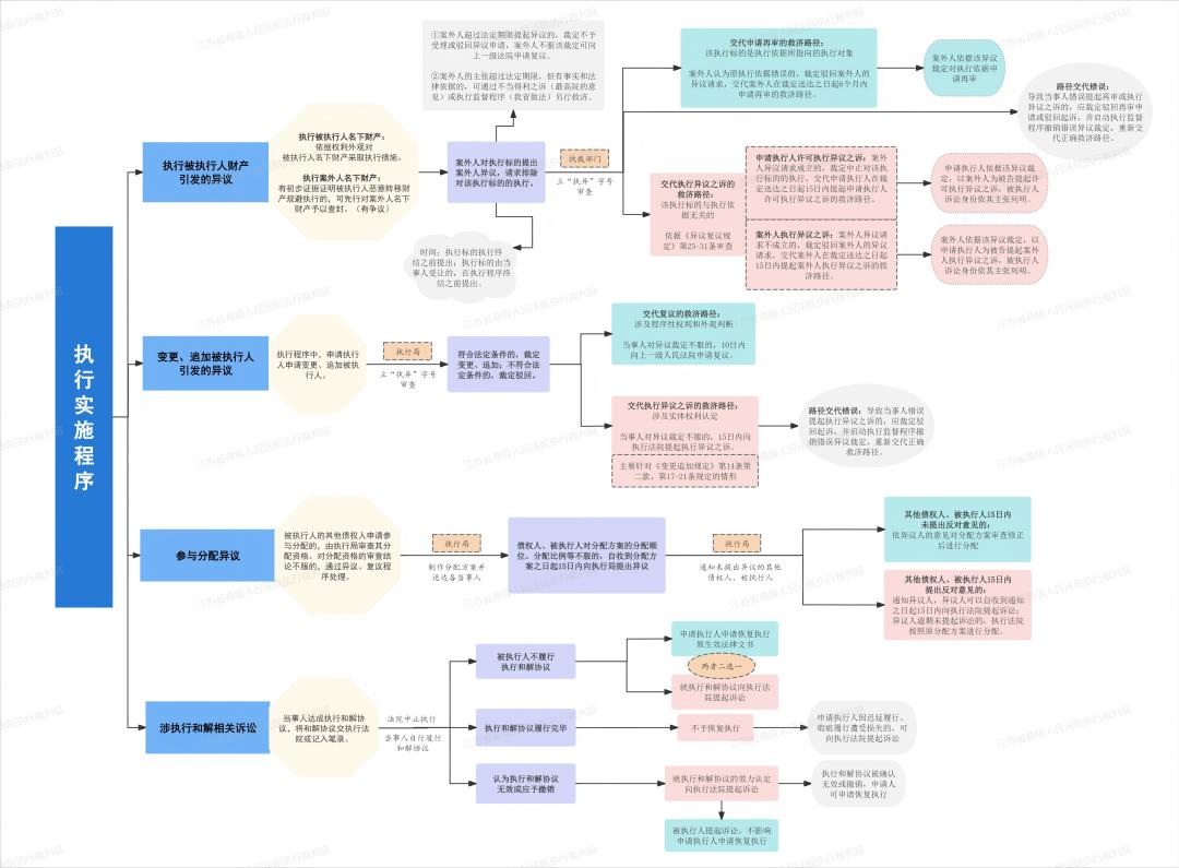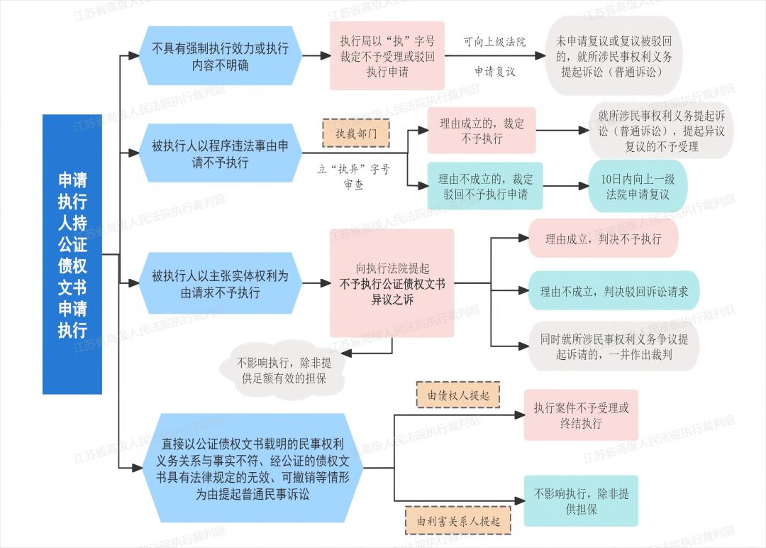 <中华人民共和国民事诉讼法>的解释》、《最高人民法院关于适用<中华人民共和国民事诉讼法>执行程序若干问题的解释》、《最高人民法院关于民事执行中变更、追加当事人若干问题的规定》、《最高人民法院关于公证债权文书执行若干问题的规定》、《最高人民法院关于执行和解若干问题的规定》(为便于阅读,本专题后续统一表述为简称:《民事诉讼法》、《民事诉讼法司法解释》、《民事诉讼法执行程序司法解释》、《变更、追加当事人规定》、《公证债权文书执行规定》、《执行和解规定》)等法律、司法解释之中,其完整性、体系性、全面性和专业性程度均无法匹配此类诉讼的特殊要求。实践中,不仅当事人往往感到陌生,就连律师等专业法律工作者,甚至部分司法人员,对此类诉讼也不够熟悉,由此导致当事人不知如何救济权利、法律服务者不当提供法律意见、法院不当裁判或程序空转等现象的出现,既损害当事人合法权益,又降低了执行效率,损害司法权威。中华人民共和国民事诉讼法>中华人民共和国民事诉讼法>为解决司法实践中执行异议之诉及与执行相关的衍生诉讼存在的适用难题,江苏高院执行裁判庭成立专门工作组,在全面梳理现有法律和司法解释规定的基础之上,几经修改完善,形成了当前我国法律规定的几类执行异议之诉及与执行相关衍生诉讼的全流程思维导图,从适用场合、程序启动、程序流转等方面作出重点提示。本专题系列将对每一种诉讼类型的特殊程序规则、与执行程序和其他审判程序的衔接协调等进行专门解读,以期为社会公众和法律服务者厘清法律概念,引导正确权利救济路径,提高人民法院相关案件的办理质效,防止程序空转并实质性化解涉执矛盾纠纷。