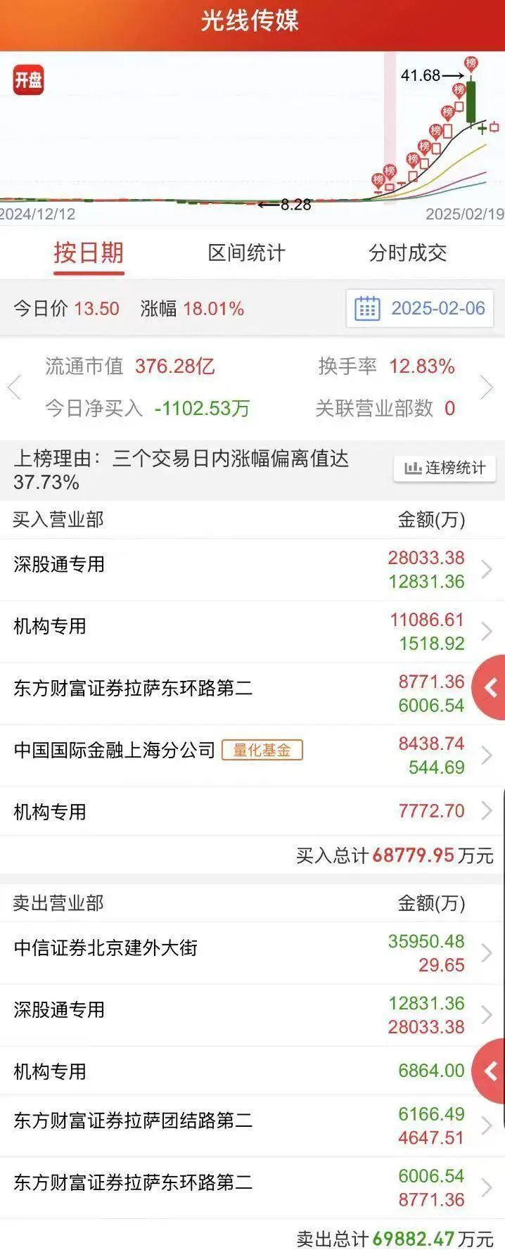 建外大街继续卖出光线传媒3.23亿;游资也基本离场。事实上光线传媒炸裂上涨过程中参与的游资并不多,他们更多是围绕市场主线如DeepSeek来布局,影视股的小利貌似不太看得上。