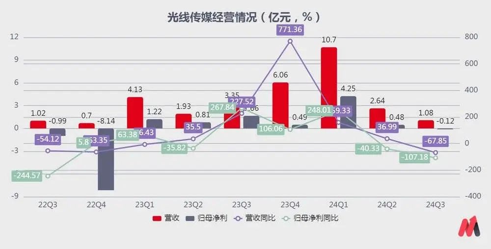 参考2024年,光线传媒前三季度总营收为14.42亿,同比增长53.37%;归母净利4.61亿,同比增长25.08%;但Q3单季营收同比下滑68%,扣非净利亏损2781万,也显示出内容方在无米下锅时的窘境。