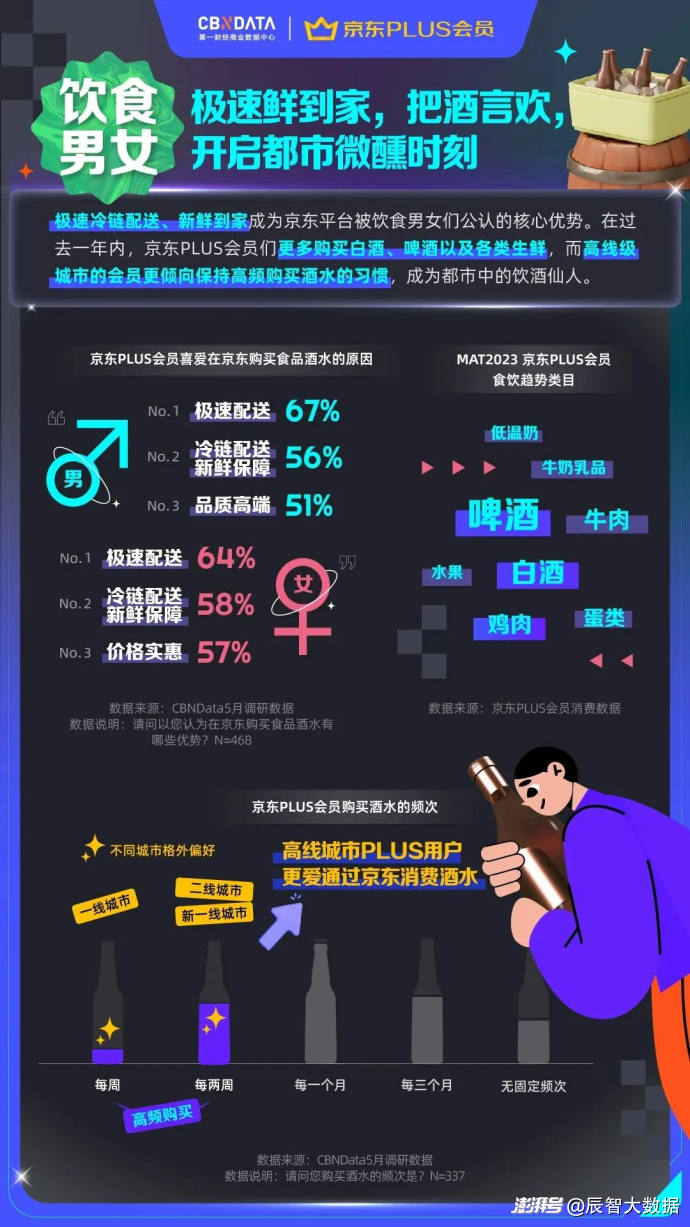 财经杂志2024年6月一项关于“618”购物节的调研显示,83%的消费者认为京东的综合购物体验(消费体验)最好。2023京东PLUS会员消费趋势洞察显示,京东PLUS会员(2023年Q1达到3500万)表示,极速冷链配送、品质高端、价格实惠是他们喜欢在京东平台购买食品酒水的重要原因。