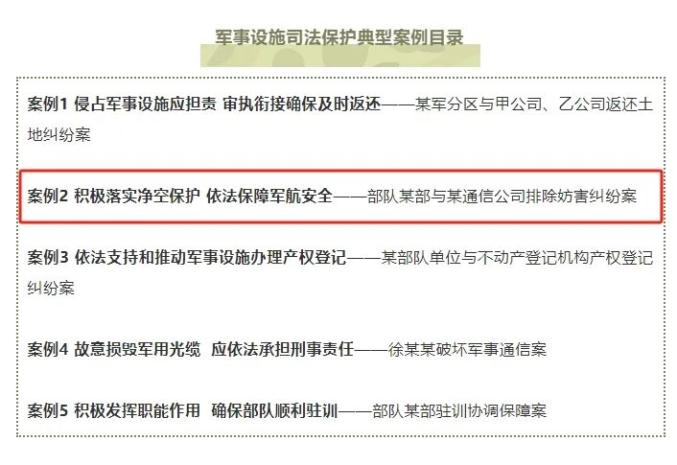 “一个案例胜过一打文件”,为发挥典型案例价值引领和行为规范作用,在《中华人民共和国军事设施保护法》颁布35周年之际,最高人民法院发布5个军事设施司法保护典型案例,彰显人民法院发挥职能作用,强化军事设施司法保护、维护国防利益的坚定决心和不懈努力,推动社会公众进一步增强国防观念和法治意识。其中,怀化中院审理的部队某部与某通信公司排除妨害纠纷案入选。