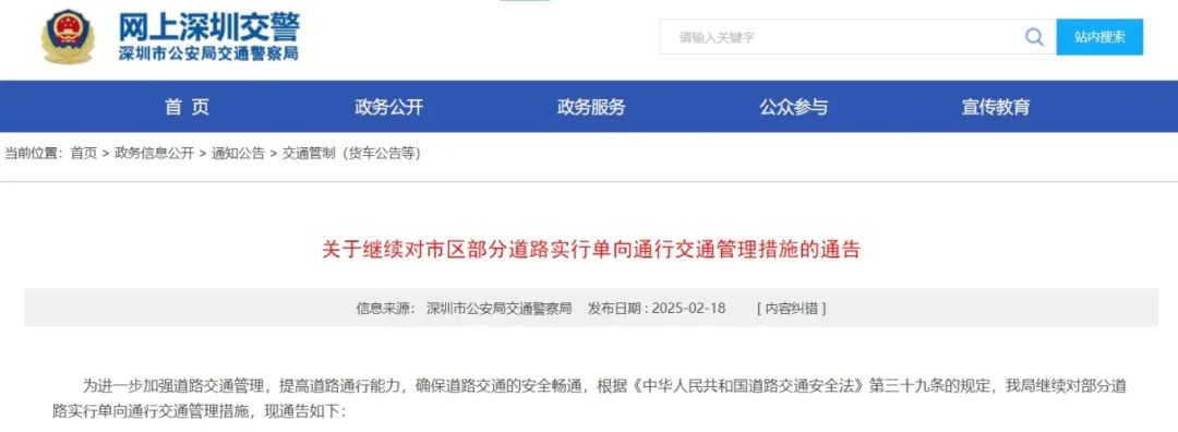 近日,深圳市公安局交通警察局发布重要通告!2025年2月24日至2026年2月23日,继续对深圳市区部分道路实行单向通行交通管理措施。