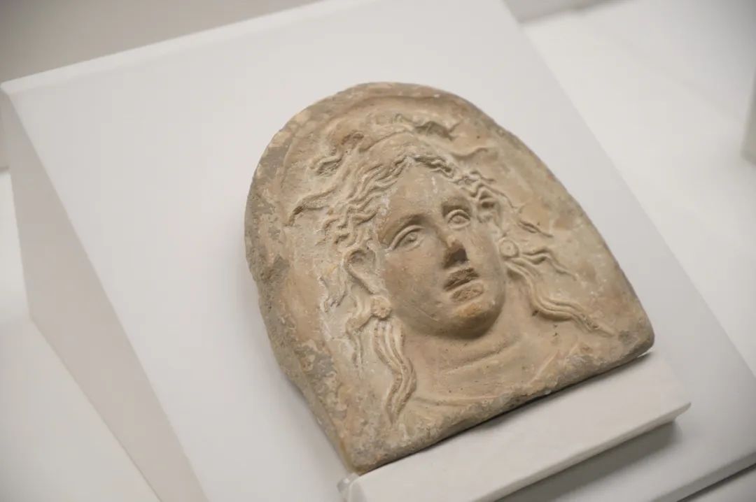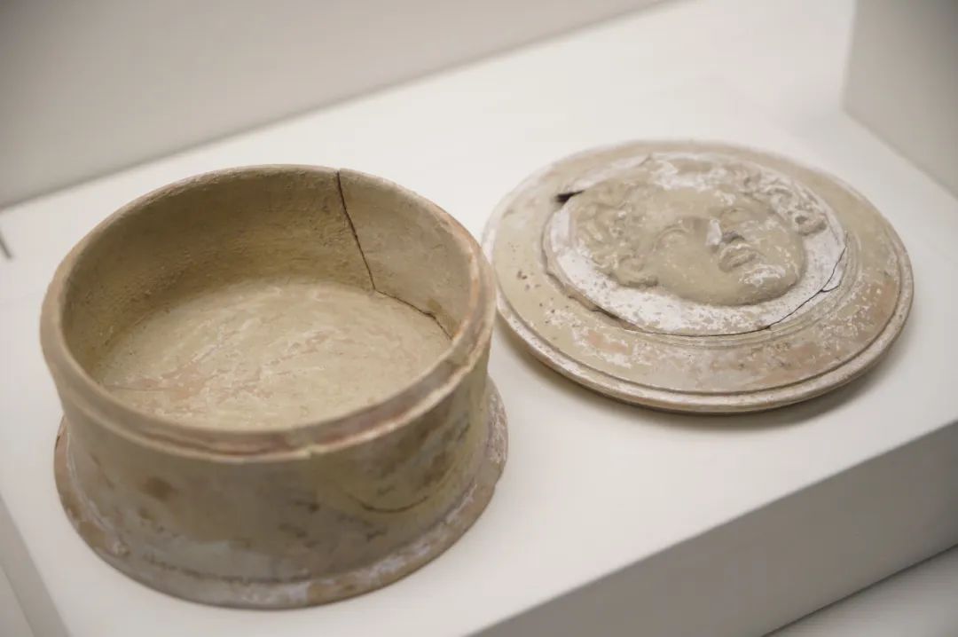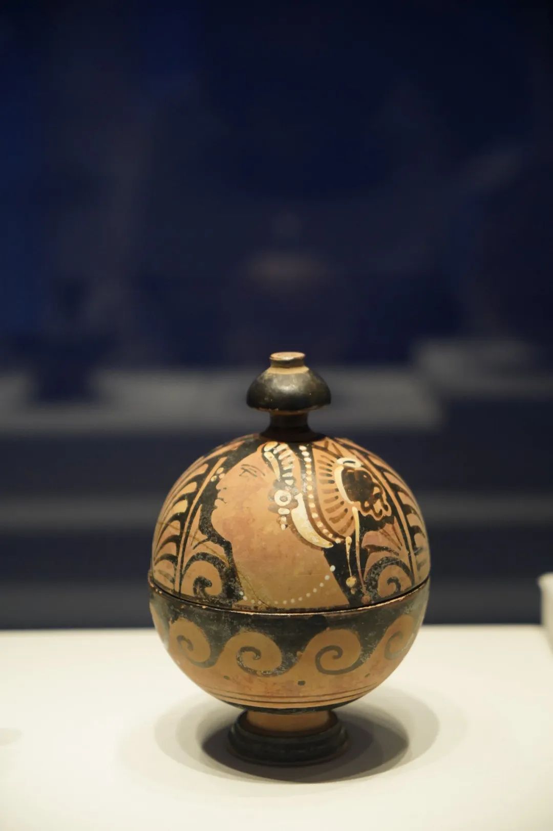 而在她的护盾上,通常还镶嵌着一张面孔,她是蛇发女妖,在这次的展出中,有的圆柱形陶盒和黑釉壶的盖子上,便以浮雕的方式,镶嵌着同款面孔。