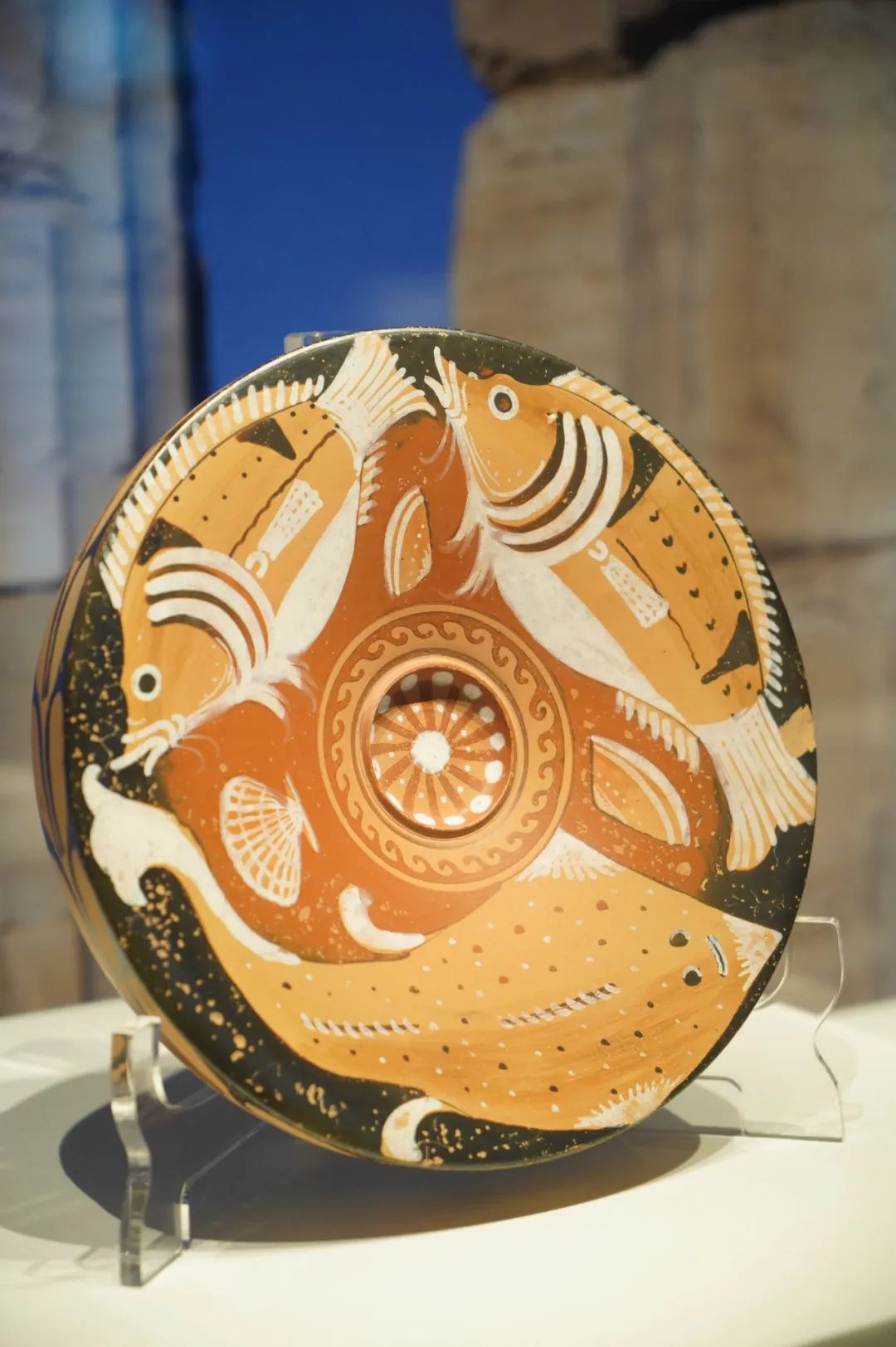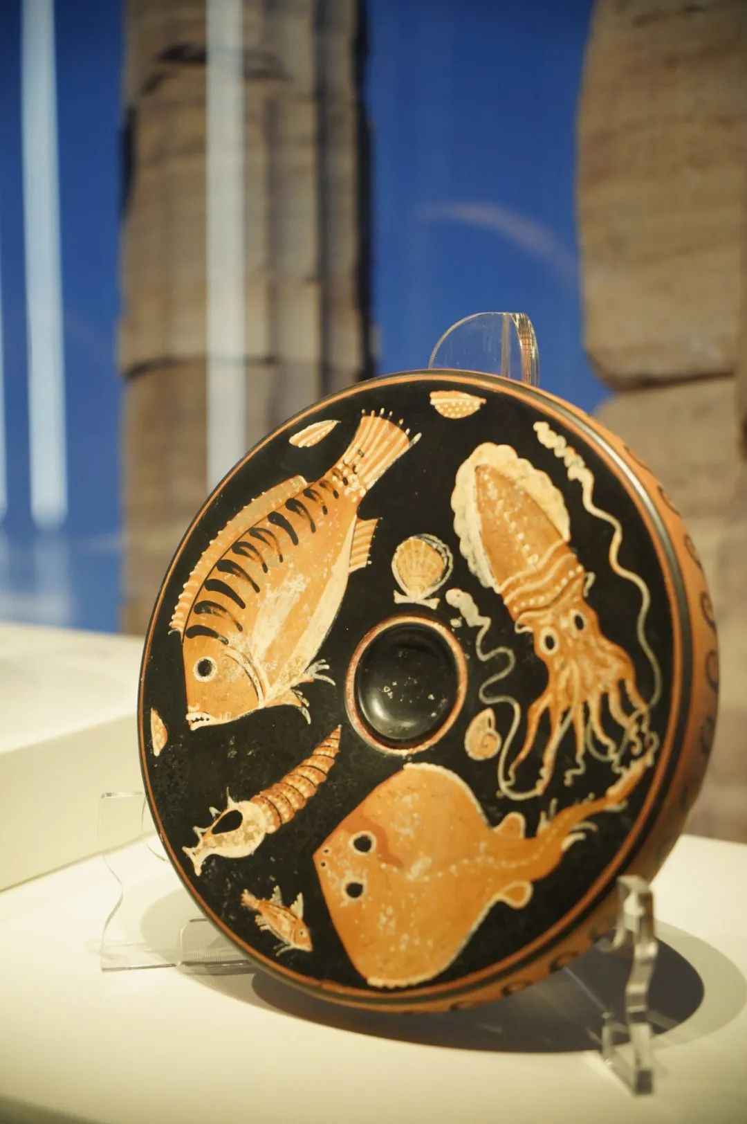 展厅里展出了大量带着海洋符号的藏品,比如绘有海浪纹图案的阿普利亚式红绘陶盒、以鱼类和海洋生物为装饰的鱼盘、绘有海豚图案的双口条纹饰壶等。