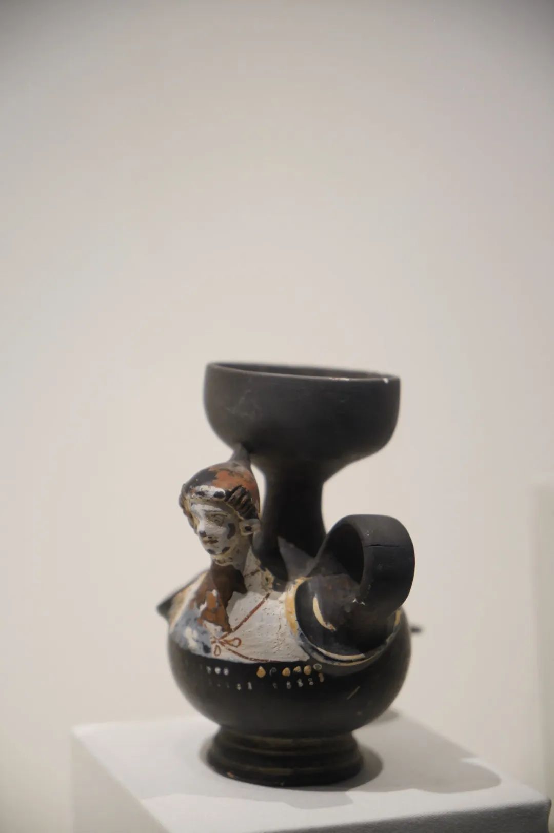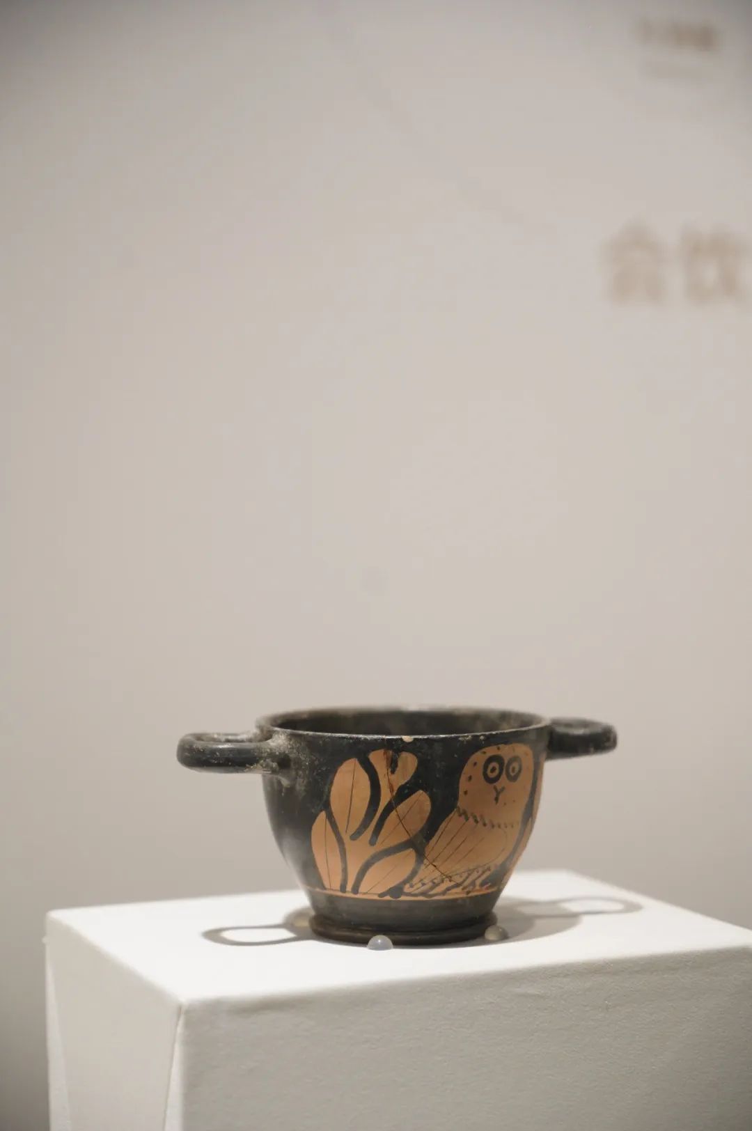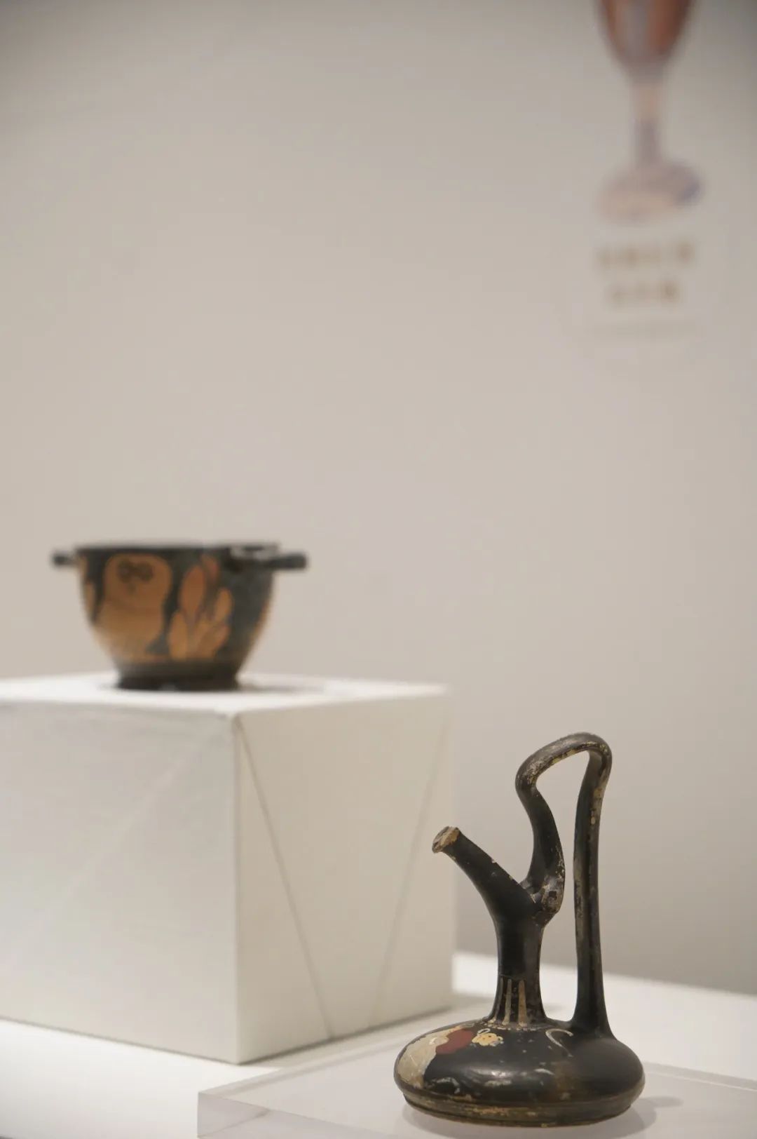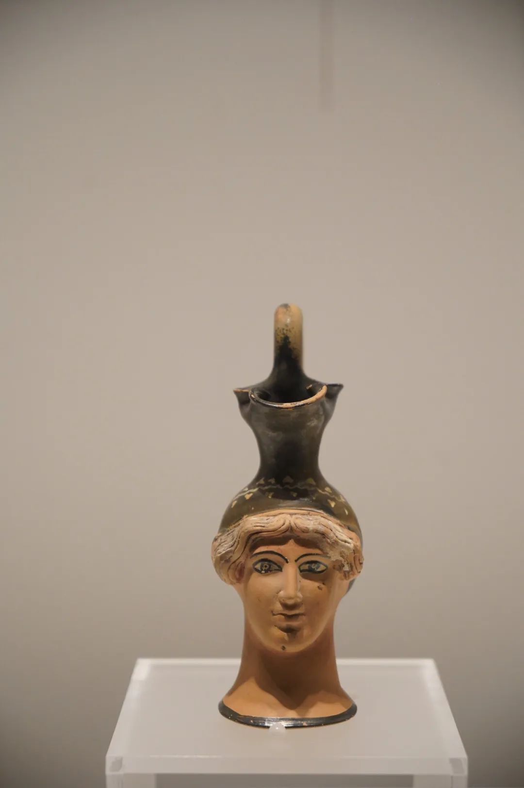 ·红绘猫头鹰式耳杯、阿普利亚式彩绘细嘴壶、青铜油灯、女性头像酒壶