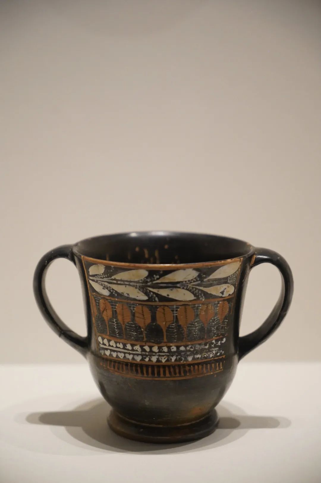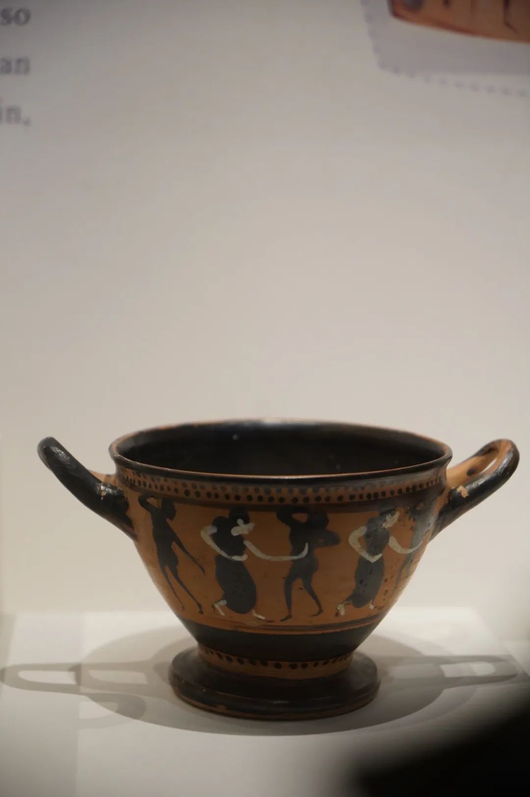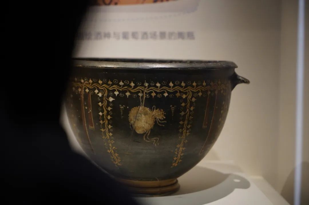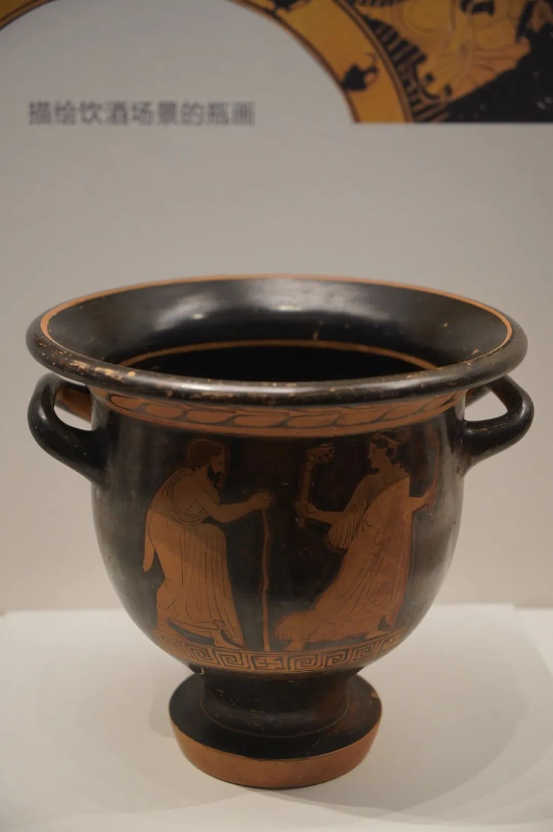 后者是狂欢和宴饮的节日,流传至今成为活动策划的常见形式,而追溯其起点,则是酒神的冒险精神和狂欢精神。在展厅中,有不少与之有关的宴饮套件,在其中的调酒缸上,也绘制着各式各样的宴饮场景。