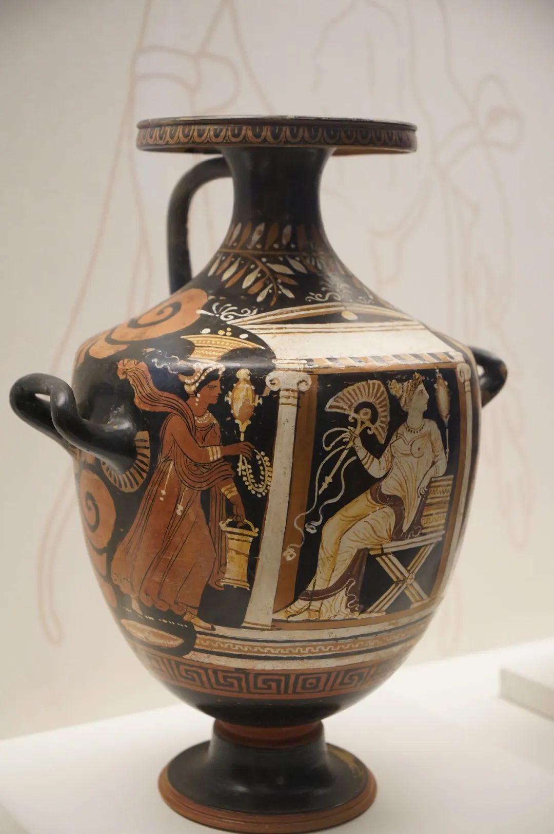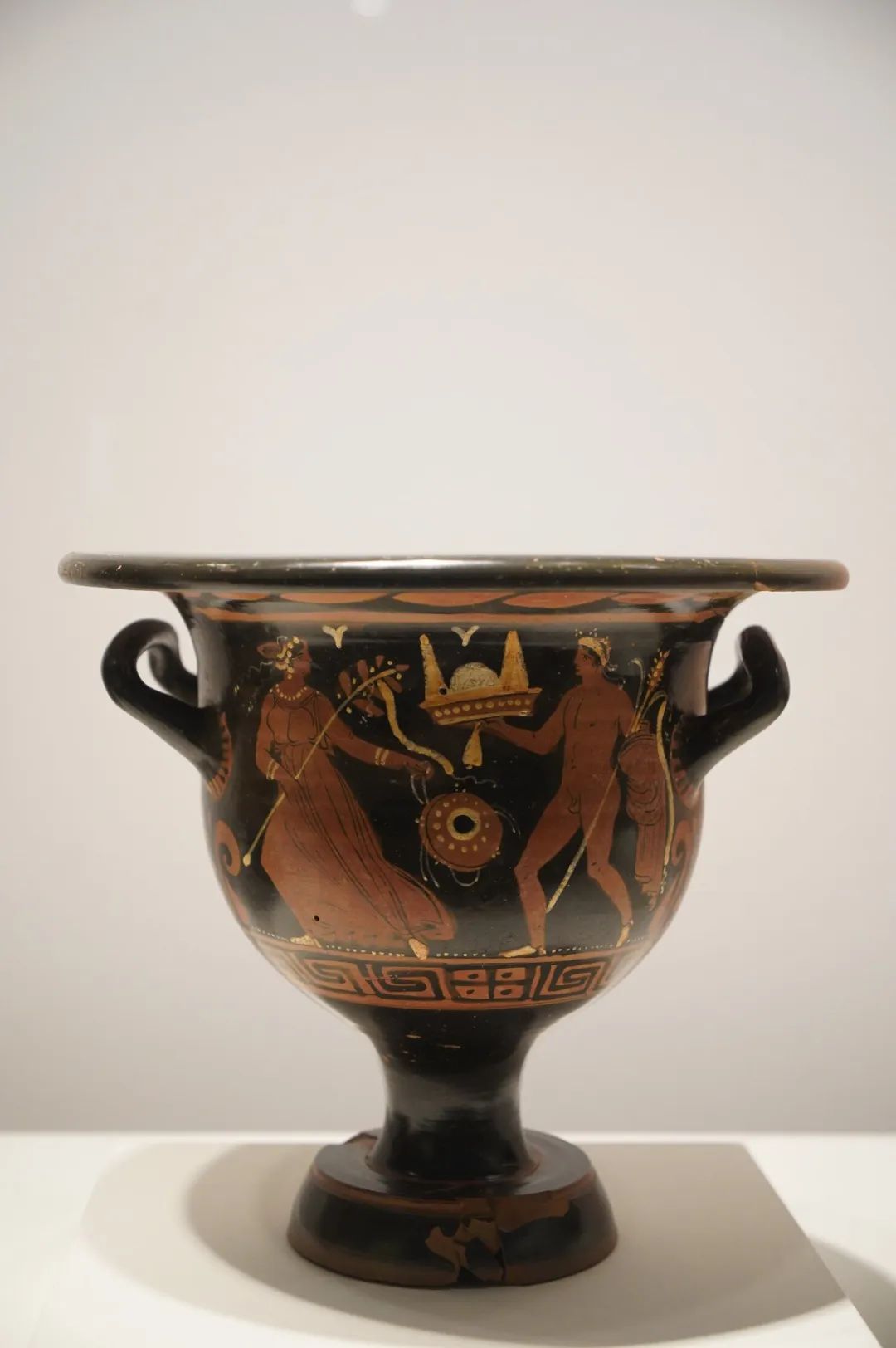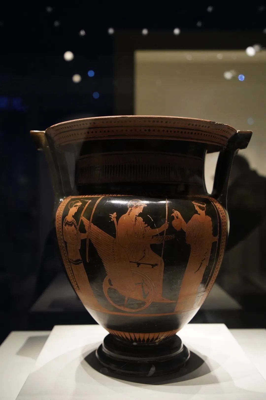 ·阿提卡式红绘柱耳型调酒缸,图中描绘了农神母女为英雄特里普托勒摩斯送别的场景