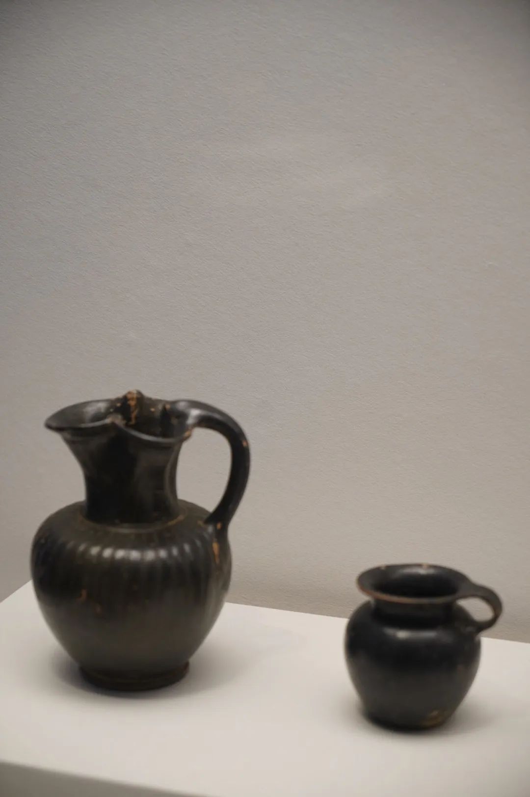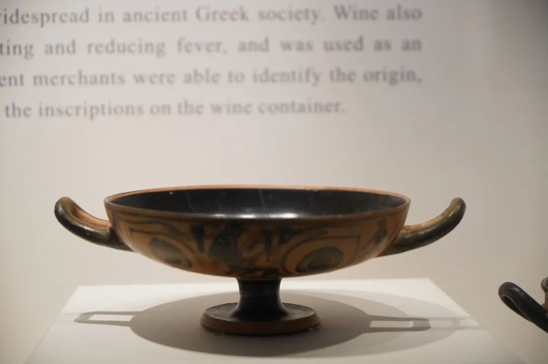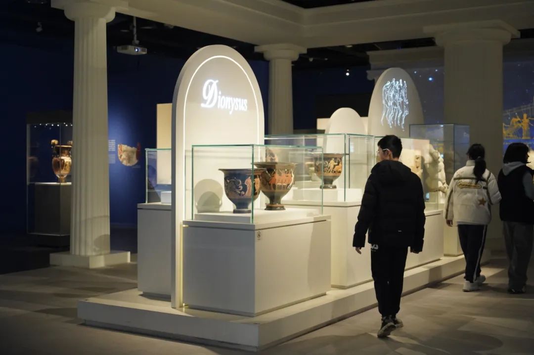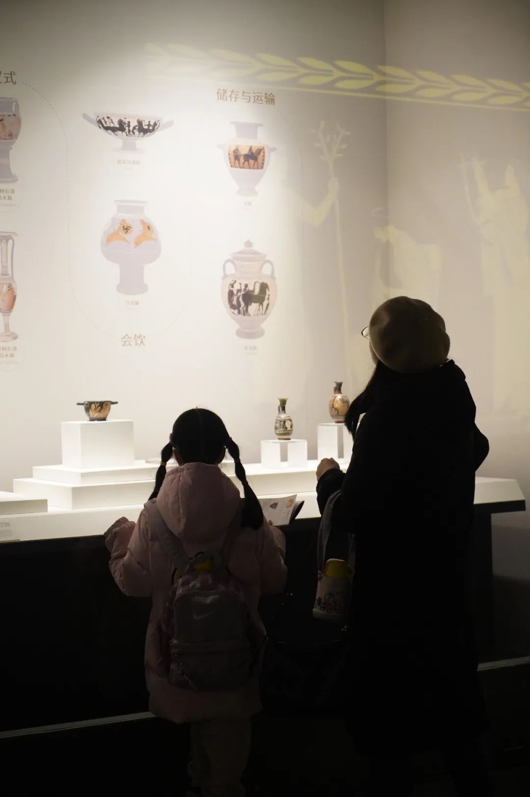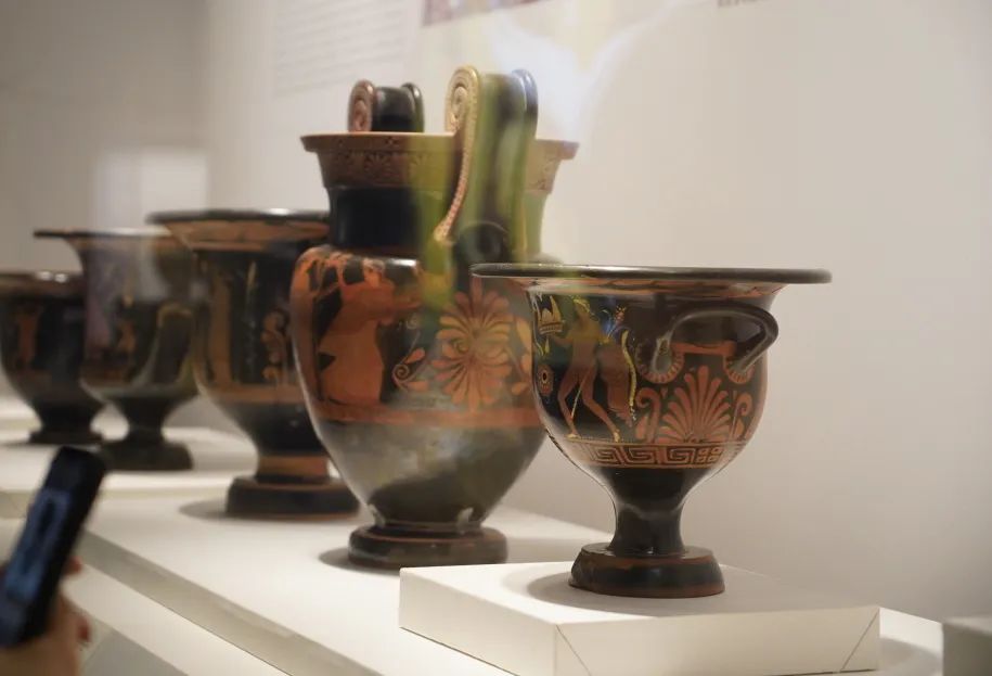 作为酒神和狂欢之神,狄俄尼索斯出现之时,身旁常伴有松果杖、酒杯、葡萄藤和常春藤冠冕,展厅里各式各样的酒器展现了古希腊人对这位神祇的崇拜。