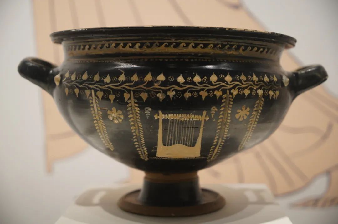 这种琴,最初由乌龟壳制成,为四弦,后来样式不断发展完善,以七弦为主,想要仔细看看它的样子,可以参考这件彩绘埃格那提亚盆上被包裹在花叶中的这把琴。