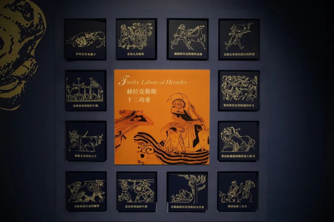 而他最著名的故事莫过于十二功业,比如杀死尼米亚狮子、砍杀永生九头蛇、制服克里特公牛等。展厅里详细讲述了这部分,并且在一些藏品图案上绘制有相关场景。