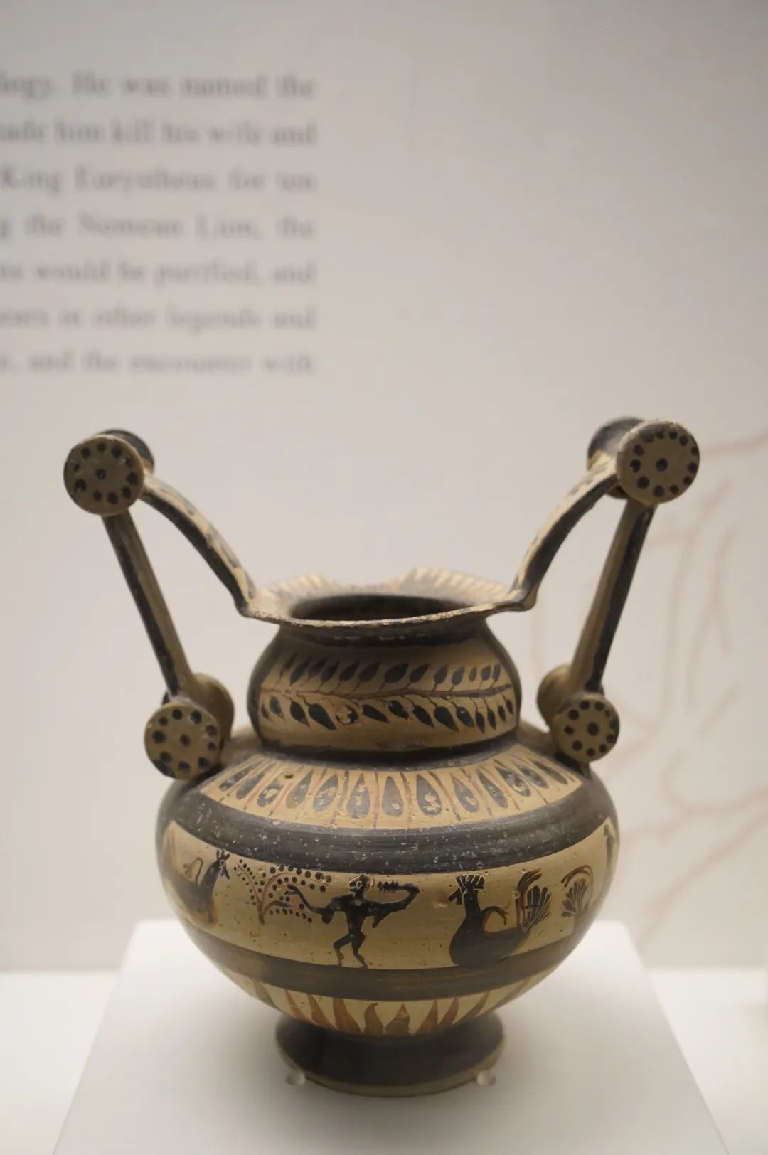 比如造型特别的褐像式碟饰壶上便绘制了他摇铃驱赶怪鸟的功绩;在它不远处的阿提卡式黑绘水罐上,还有他与尼米亚狮子搏斗的场景。
