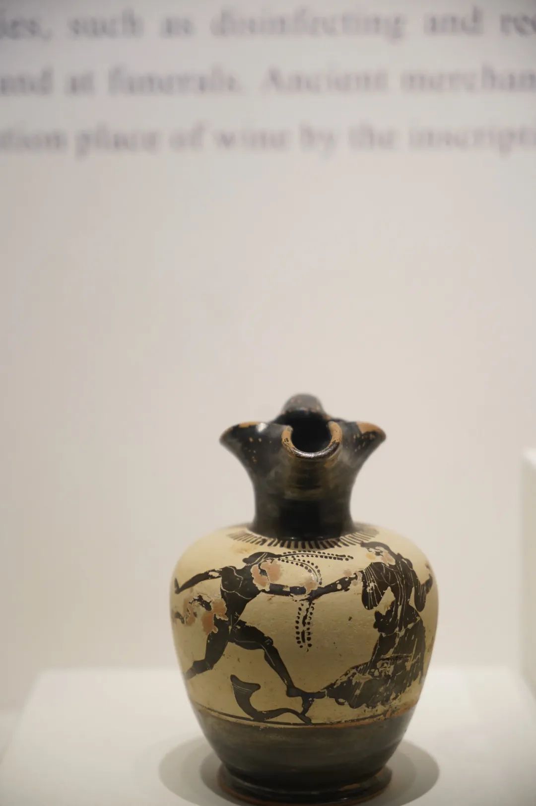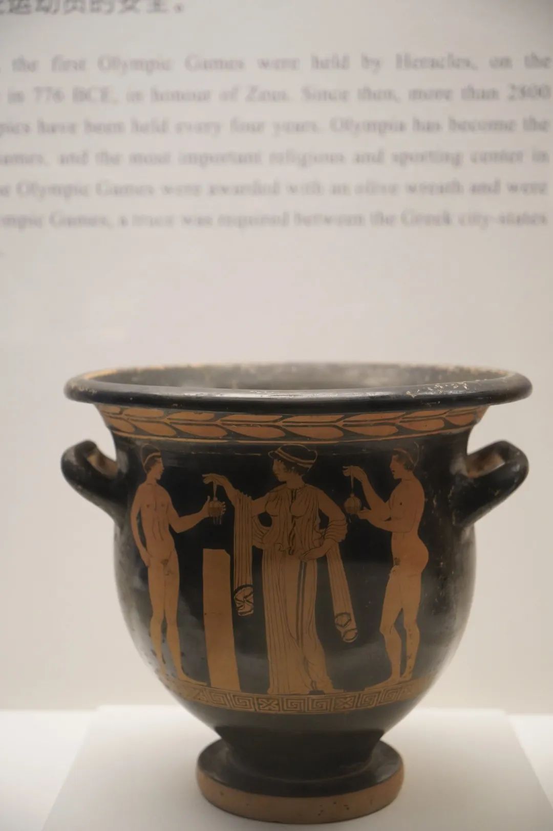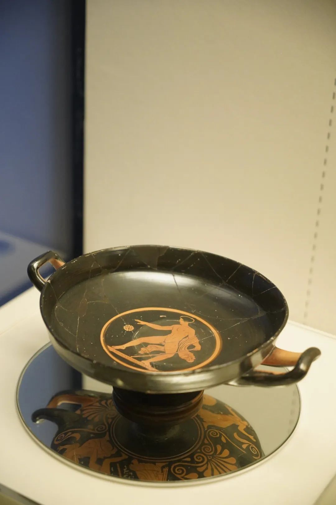 此外,游走在展厅,我们还能看见一只阿提卡式红绘双耳杯,盘中图案描绘了一个正在拍球的男子;它隔壁的卢坎尼亚式红绘调酒缸上则是运动员抵达赛道终点的场景。