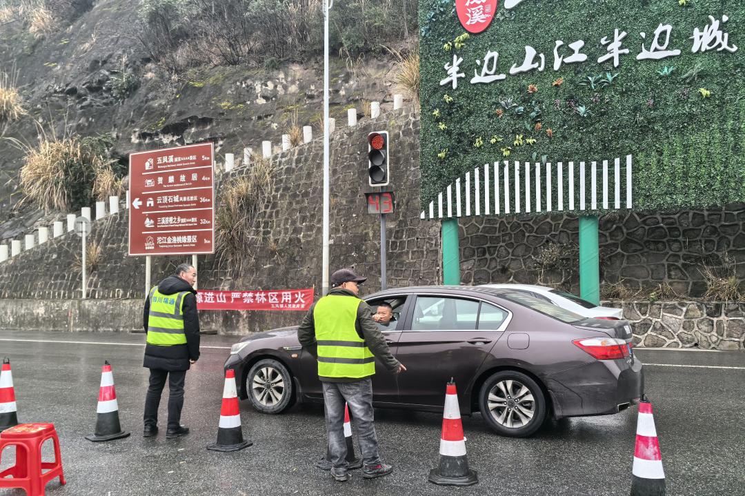 工作人员引导过往车辆绕行