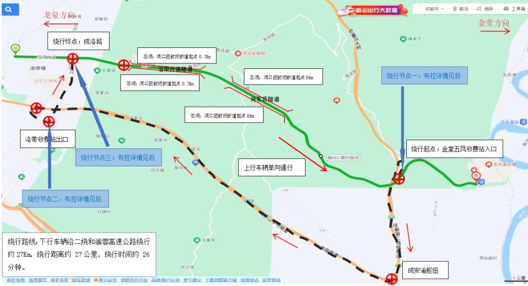龙泉驿区S101省道洛带古镇隧道加固工程封闭施工交通管制布置绕行示意图