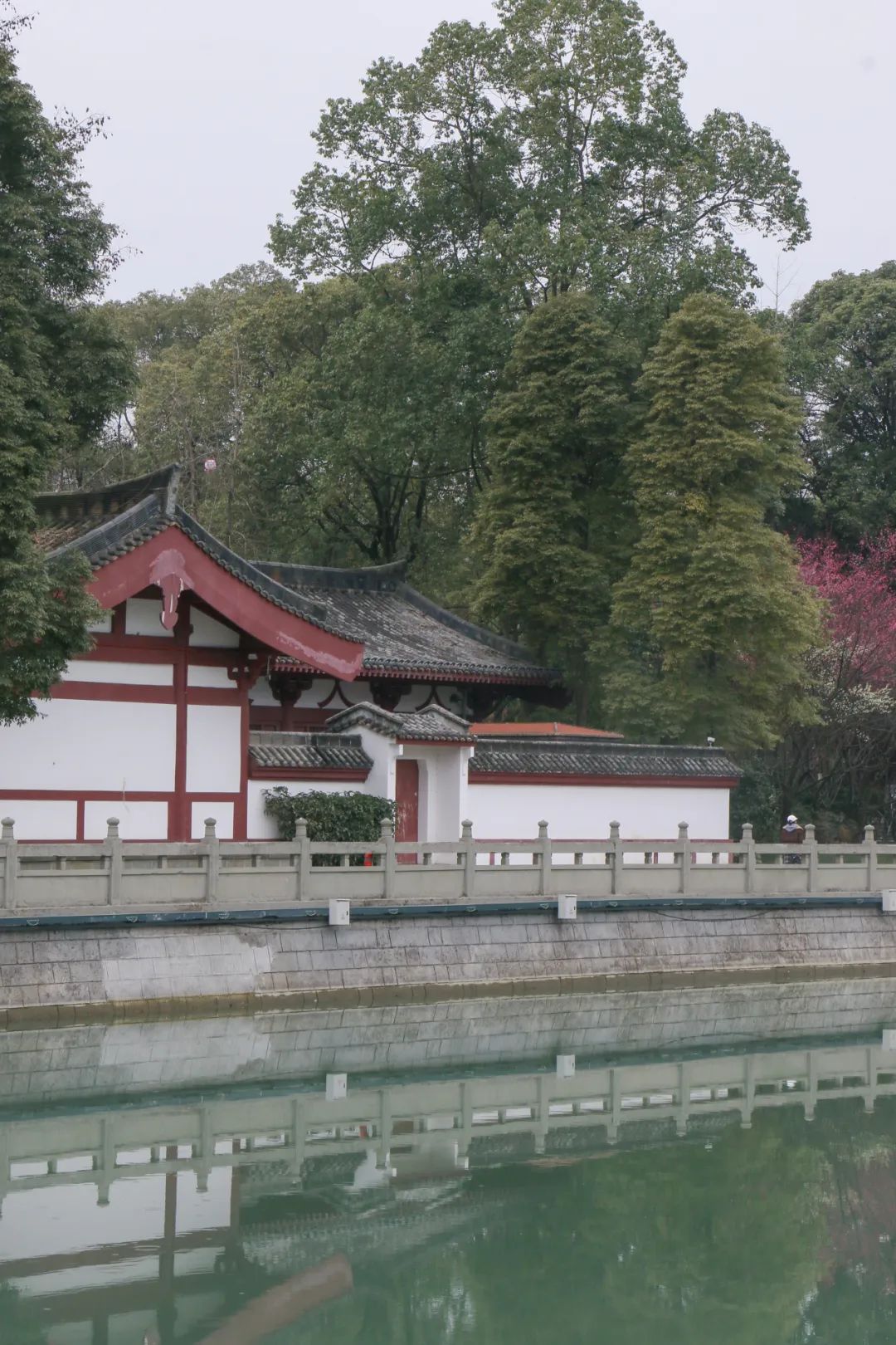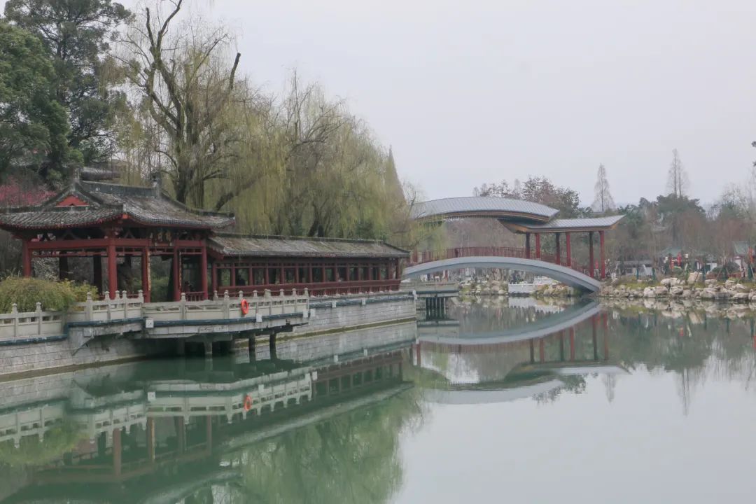 昌明河畔,一侧是当地人从小耍到大的太白公园,另一侧便是李白纪念馆。还未走近,细柳、梅花、绿树、长廊便描绘出一幅怡人之景。