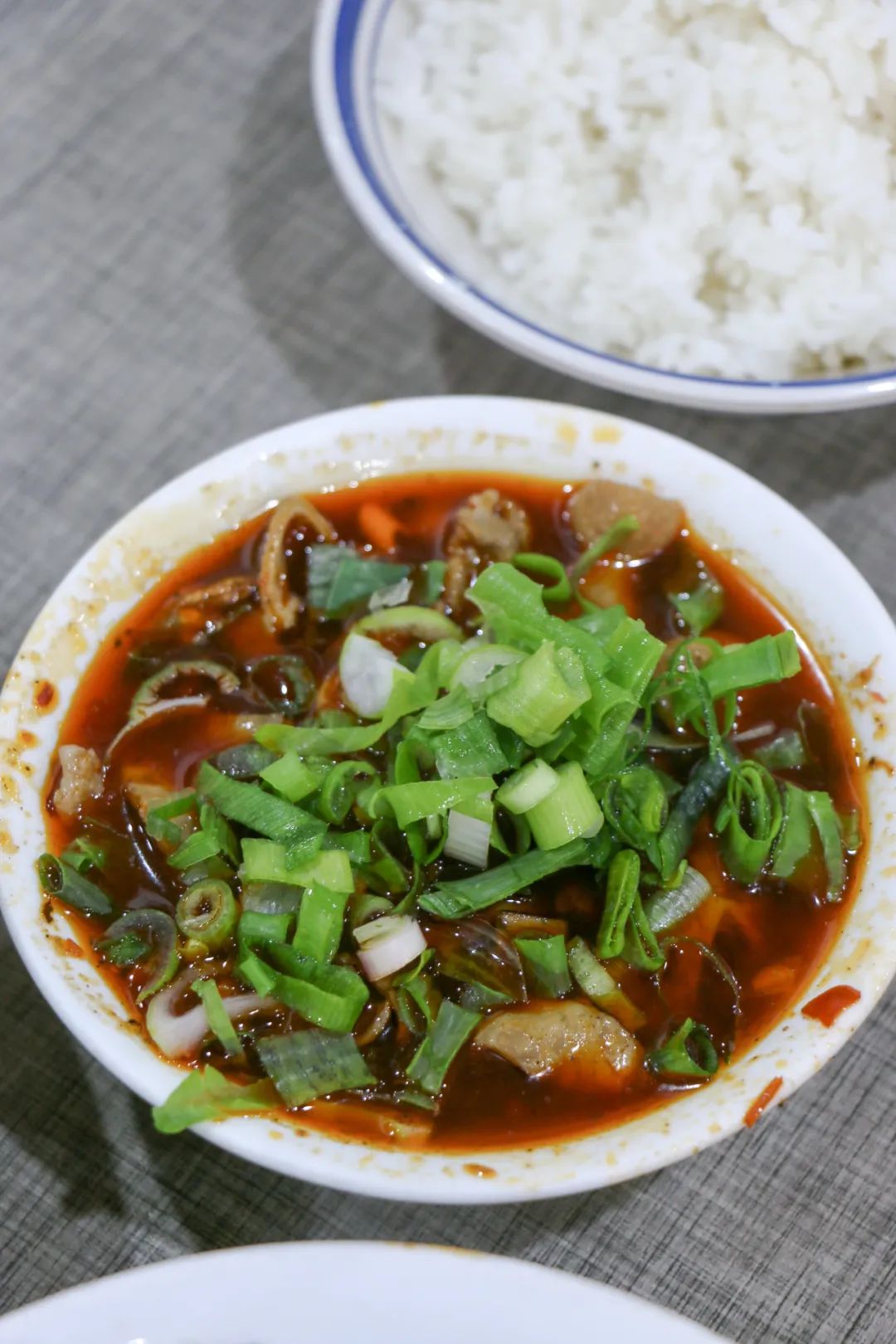 上菜很快,红烧肥肠配醋汤的吃法第一次见,据说只有江油的红烧肥肠才叫“江油肥肠”。第一筷子献给这道菜,柔韧、劲道、喷香,有嚼劲但又咬得断,吃完再喝一口醋汤,“江油是全世界肥肠的故乡”这个头衔成立了。