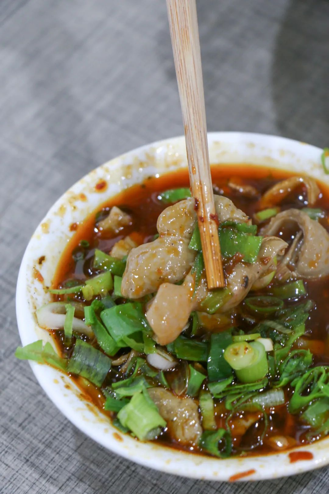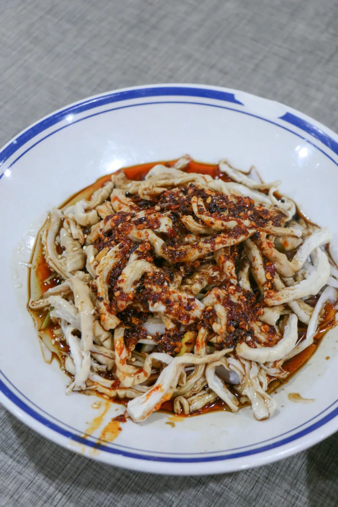 凉拌肥肠又是另一种口感,肥肠切成细条,搭配大葱丝、芹菜丝、藕条,淋上秘制红油,很香且一点都不辣,花椒味和醋味很明显,搅拌后每夹起一筷子还要在料汁里晃一晃,避免吃到没搅匀的花椒粉的同时多挂点汁。