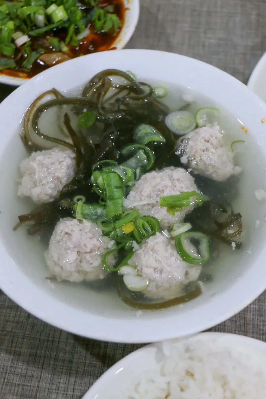 店里果然生意很好,大堂和外摆都坐满了人,肥肠做法多样,干煸、火爆、凉拌、卤制、清炖、粉蒸等,我们点了招牌的凉拌肥肠和红烧肥肠,配了素雅的清汤圆子和凤尾。