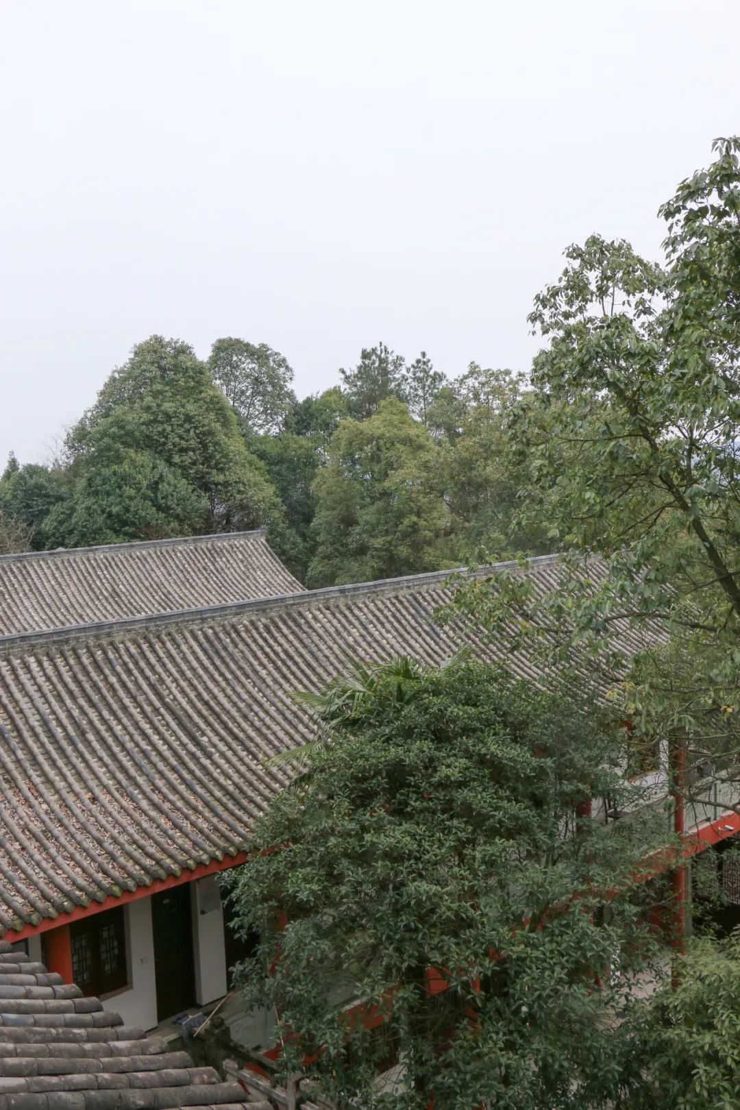 沿着阶梯往上爬时,觉得这里和新津的老君山有些相似。翠屏山——仅字面意义而言,树木苍翠,确如屏障,与屋顶瓦片组成和谐一景,意境悠然。