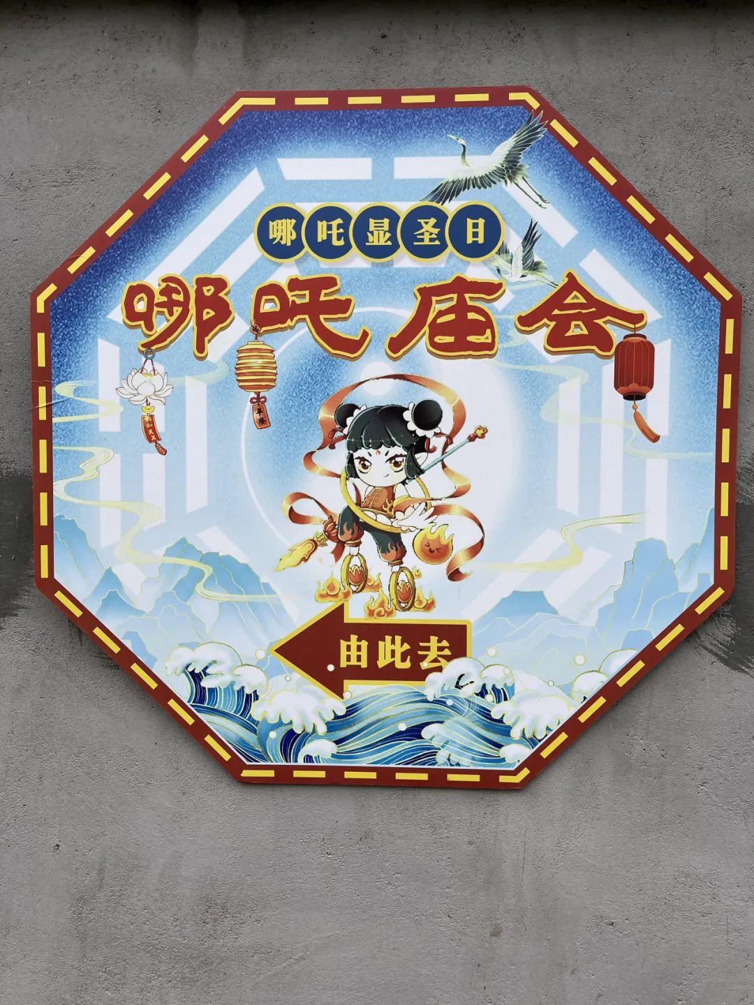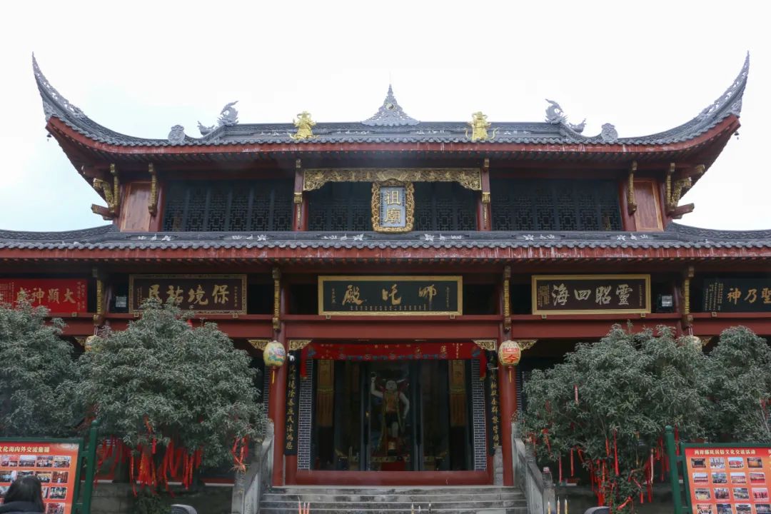 想起在上山途中,在某户人家门口的墙壁上,我拍到了一张“哪吒庙会”。后搜索发现:每年的农历三月十三是哪吒显化日,翠屏山会举行为期三天的哪吒真人法会。许多人来此处参加活动,可以观看川剧《哪吒出世》《哪吒闹海》表演等。听起来就十分有趣。